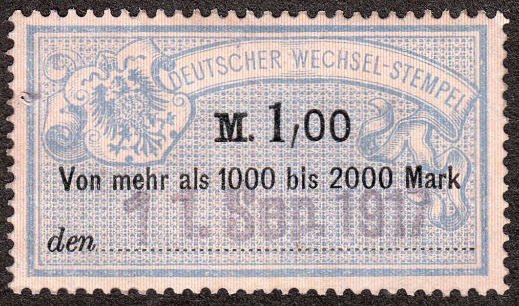 Hier als Beispiel die Wertstufe zu 1,00 Mark für eine Summe "Von mehr als 1000 bis 2000 Mark", entwertet per Datumstempel am 11.09.1917, also in deutlich späterer Verwendung als die zuvor gezeigten Marken, jetzt als Vordruck ohne Eindruck des Jahrhunderts "18":