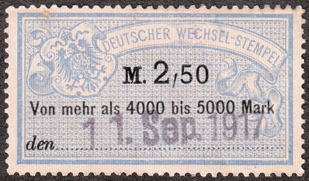 Diese Marke der Wertstufe "M. 2,50" entsprach am 11.09.1917, also vor der Gebührenerhöhung, der Gebührenstufe für eine Summe "Von mehr als 4000 bis 5000 Mark":