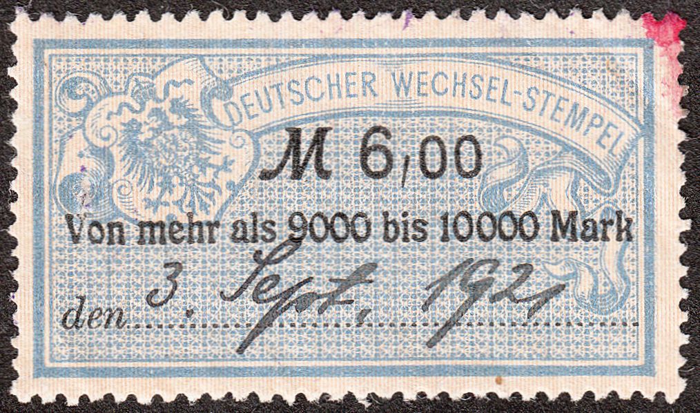 Diese Marke der Wertstufe "M 6,00" entsprach am 03.09.1921 der Gebührenstufe für eine Summe "Von mehr als 9000 bis 10000 Mark":