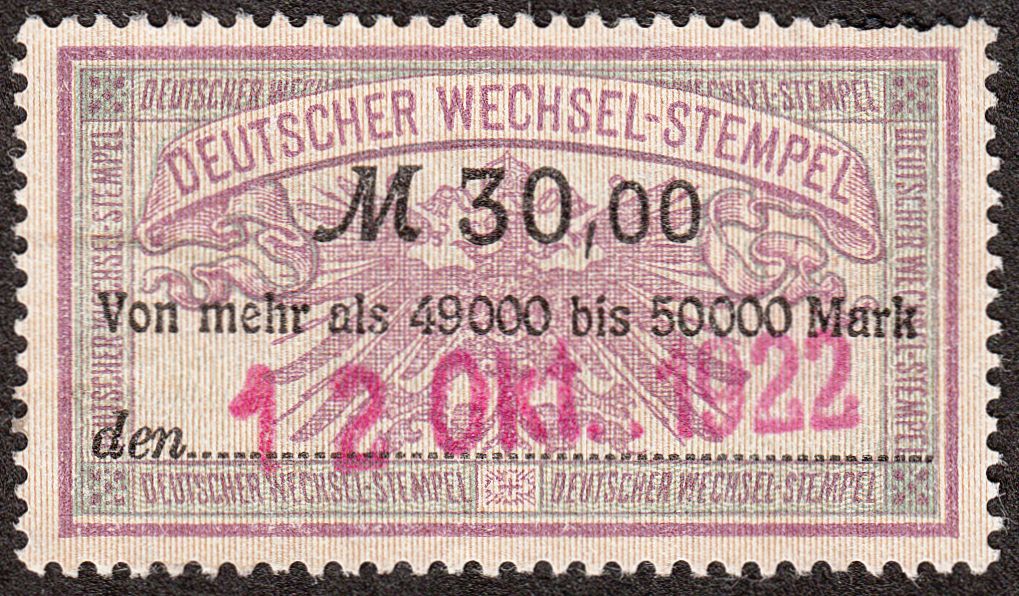 Hier als Beispiel die Wertstufe "M 30,00" gültig für eine Summe "Von mehr als 49000 bis 50000 Mark", entwertet per Datumstempel am 12.10.1922: