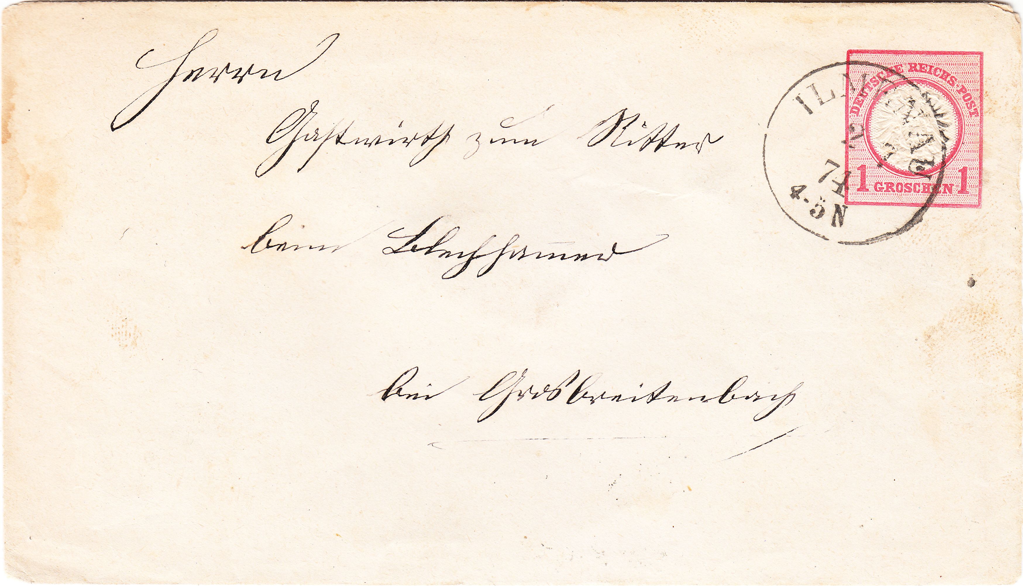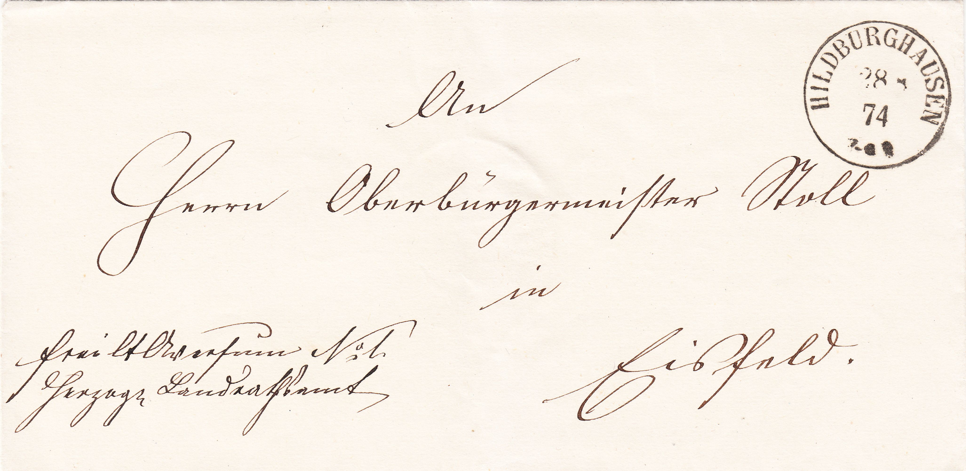Dieser Beleg vom 28.08.1874 zeigt einen nachverwendeten NDP-Kreisstempel HILDBURGHAUSEN, katalogisiert als Feuser NDP 488: