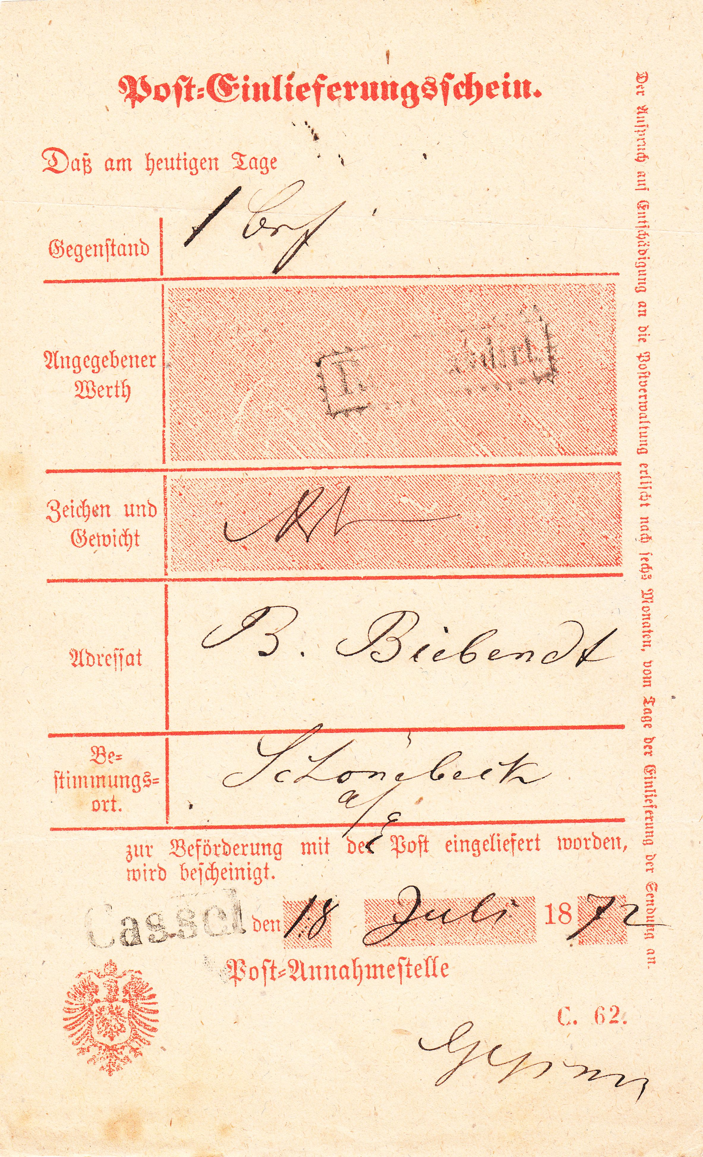 Heute stelle ich Euch dieses Formular "Post-Einlieferungsschein." mit Eindruck "Grosses Brustschild" vor, das am 18.07.1872 in "Cassel" verwendet wurde: