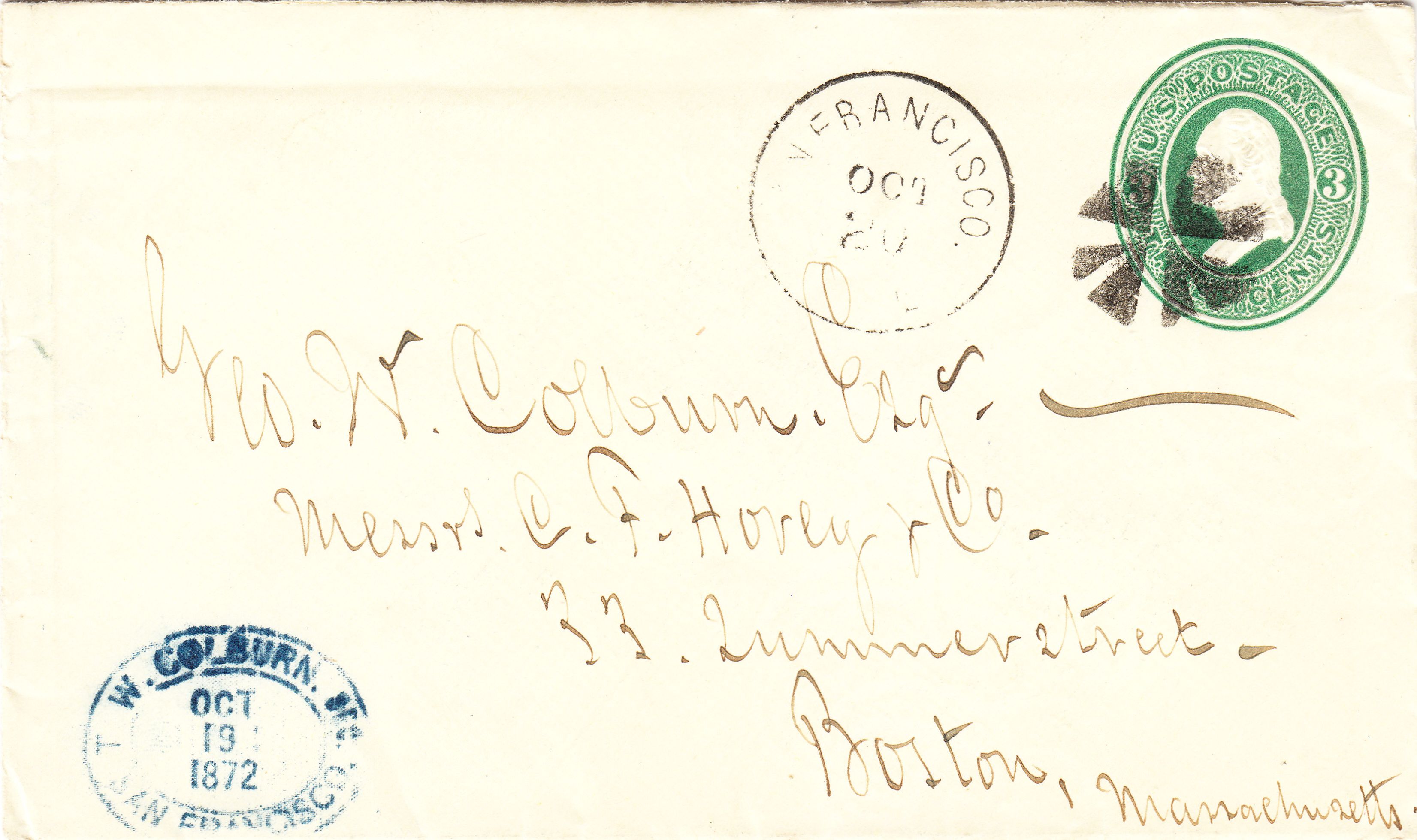 Hier zum Start dieses Kapitels unserer Brustschildsammlung ein Ganzsachenumschlag aus den USA, aufgegeben am 20.10.1872 in SAN FRANCISCO: