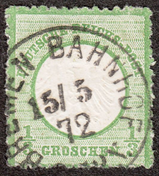 Heute eine nach unten dezentrierte MiNr. 2 mit nach unten links versetzter Prägung sowie rauer Zähnung, entwertet am 15.05.1872 per nachverwendetem NDP-Kreisstempel "BREMEN BAHNHOF", katalogisiert als Feuser NDP 135: