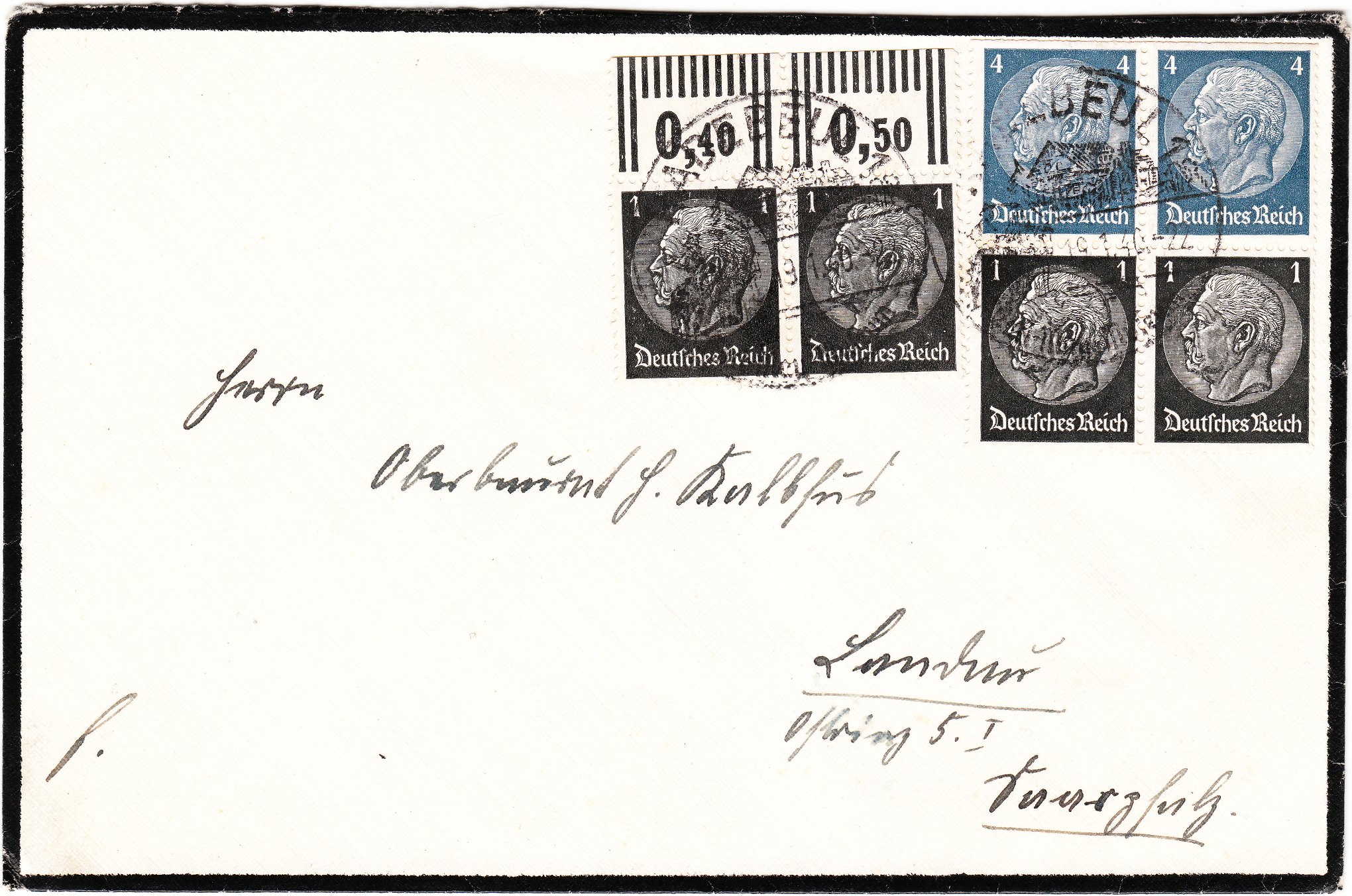 Dieser Trauerbrief, gelaufen von Radebeul nach Landau in der Saarpfalz, somit im Fernverkehr der Portostufe 12 Pfennig, wurde portorichtig freigemacht per Mischfrankatur von zwei zusammenhängenden Zusammendrucken S 171 mit der üblichen "Heftchenzähnung", d.h. oben abgeschnittener Zähnung, sowie einem waagerechten Paar des Wertes zu 1 Pfennig vom Oberrand, MiNr. 512 W OR 2'9'2:
