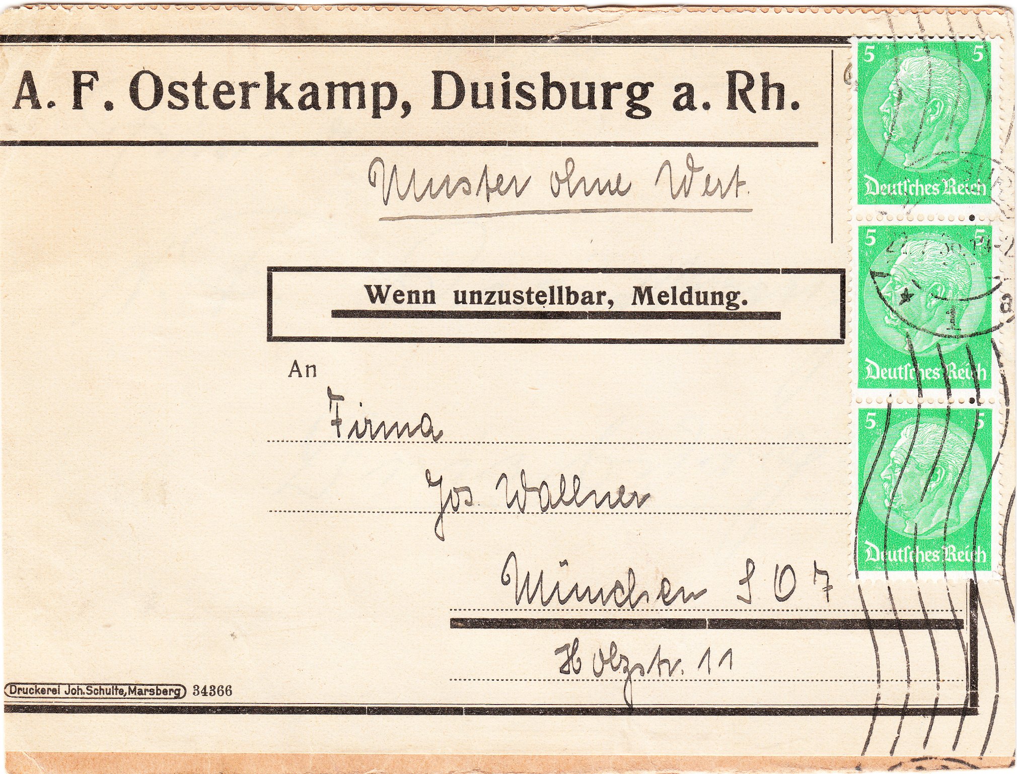 Eine Warenprobe = "Muster ohne Wert" mit einem Gewicht von 100 bis 250 g kostete dem Tarif für Drucksachen entsprechend nur 15 Pfennig an Porto, hier dargestellt durch den Adreßteil mit einer Mehrfachfrankatur von 3 Stück der MiNr. 515 = Hindenburg 5 Pfennig smaragdgrün mit Wasserzeichen Hakenkreuze: