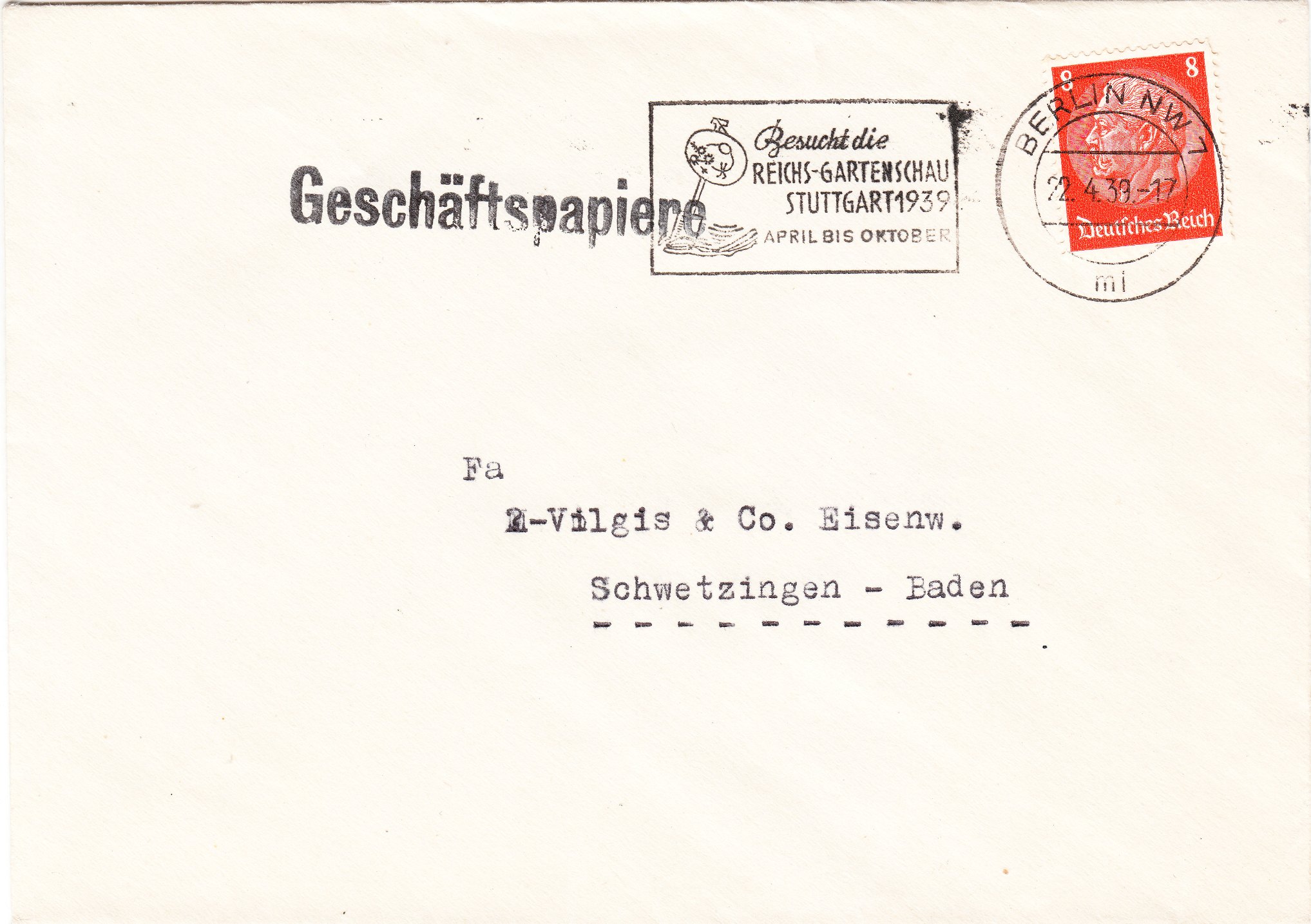 EF der 1934 MiNr. 517 8 Pfennig gelblichrot bis zinnober Wasserzeichen Hakenkreuze am 22.04.1939 portogerecht auf Sendungsart "Geschäftspapiere" von Berlin nach Schwetzingen gelaufen: