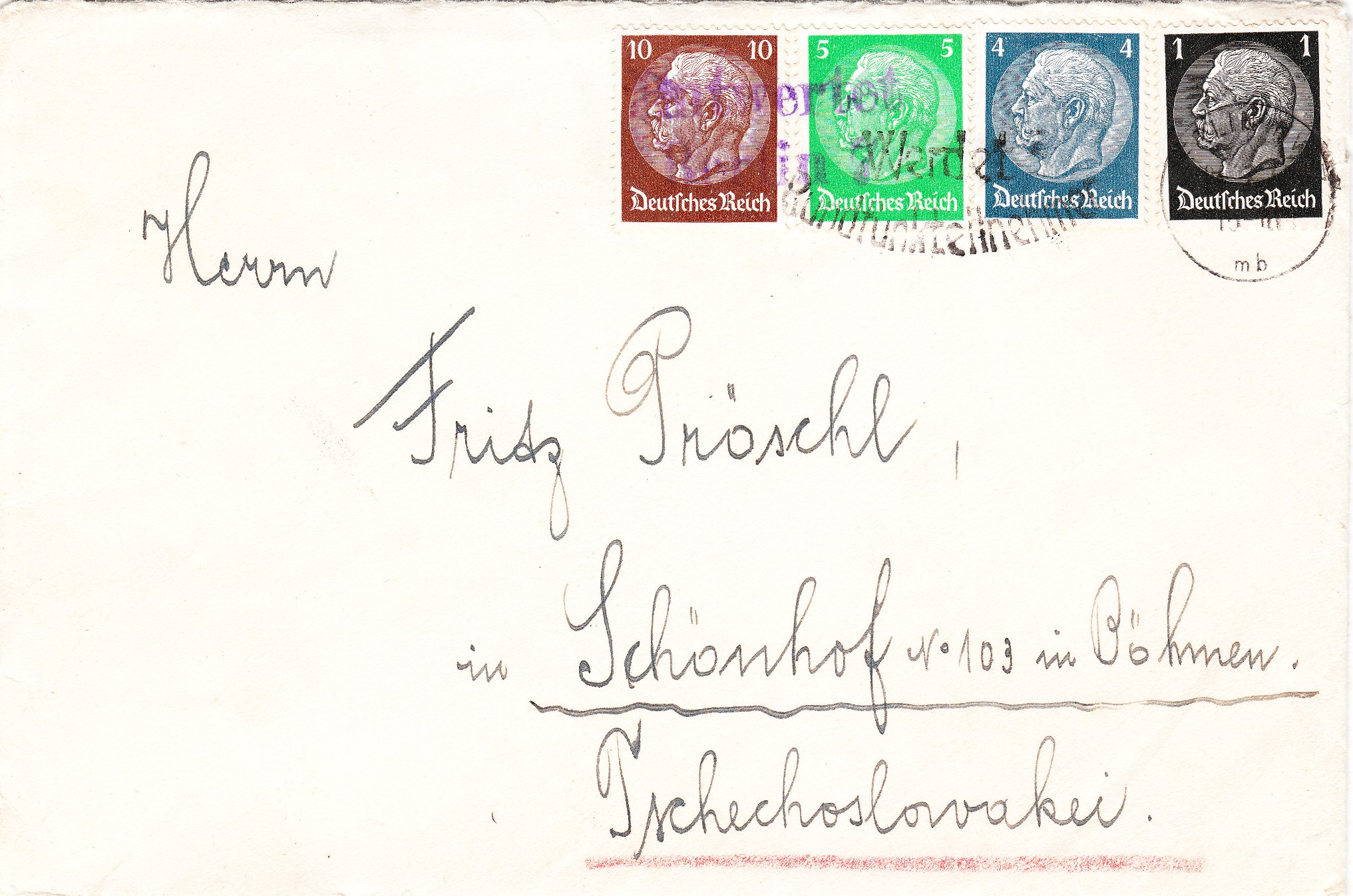 Brief in die Tschechoslowakei zum Sondertarif von 20 Pfennig als Mischfrankatur von vier Werten der Dauerserie Hindenburg-Medaillon ab Berlin 7: