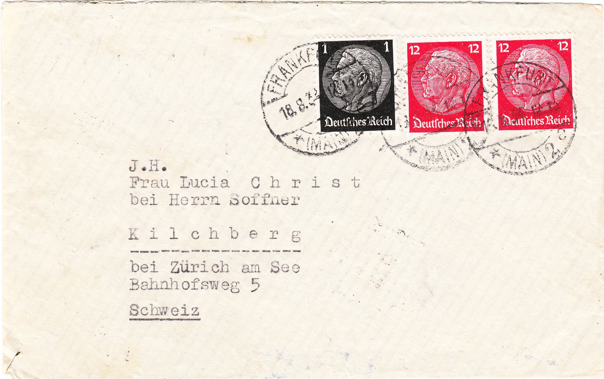 In die Schweiz adressierter Brief, aufgegeben am 18.08.1934 in Frankfurt am Main, portorichtig frankiert mit 25 Pfennig der Dauerserie Hindenburg-Medaillon: