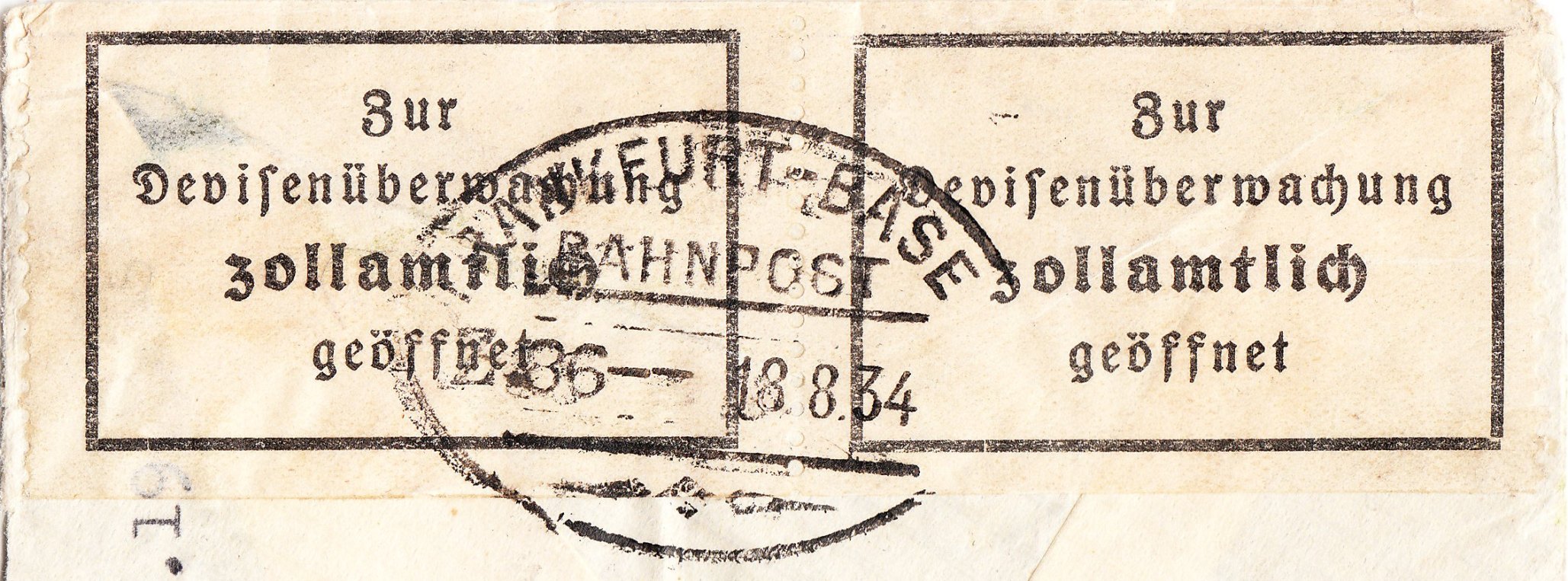 Der Brief wurde auf der Eisenbahnstrecke "FRANKFURT-BASEL" rückseitig geöffnet, der Devisenüberwachung unterzogen und mit einem Verschlußstreifen wieder verschlossen, was ein Bahnpoststempel "FRANKFURT-BASEL BAHNPOST Z 86-- 18.8.34" dokumentiert: