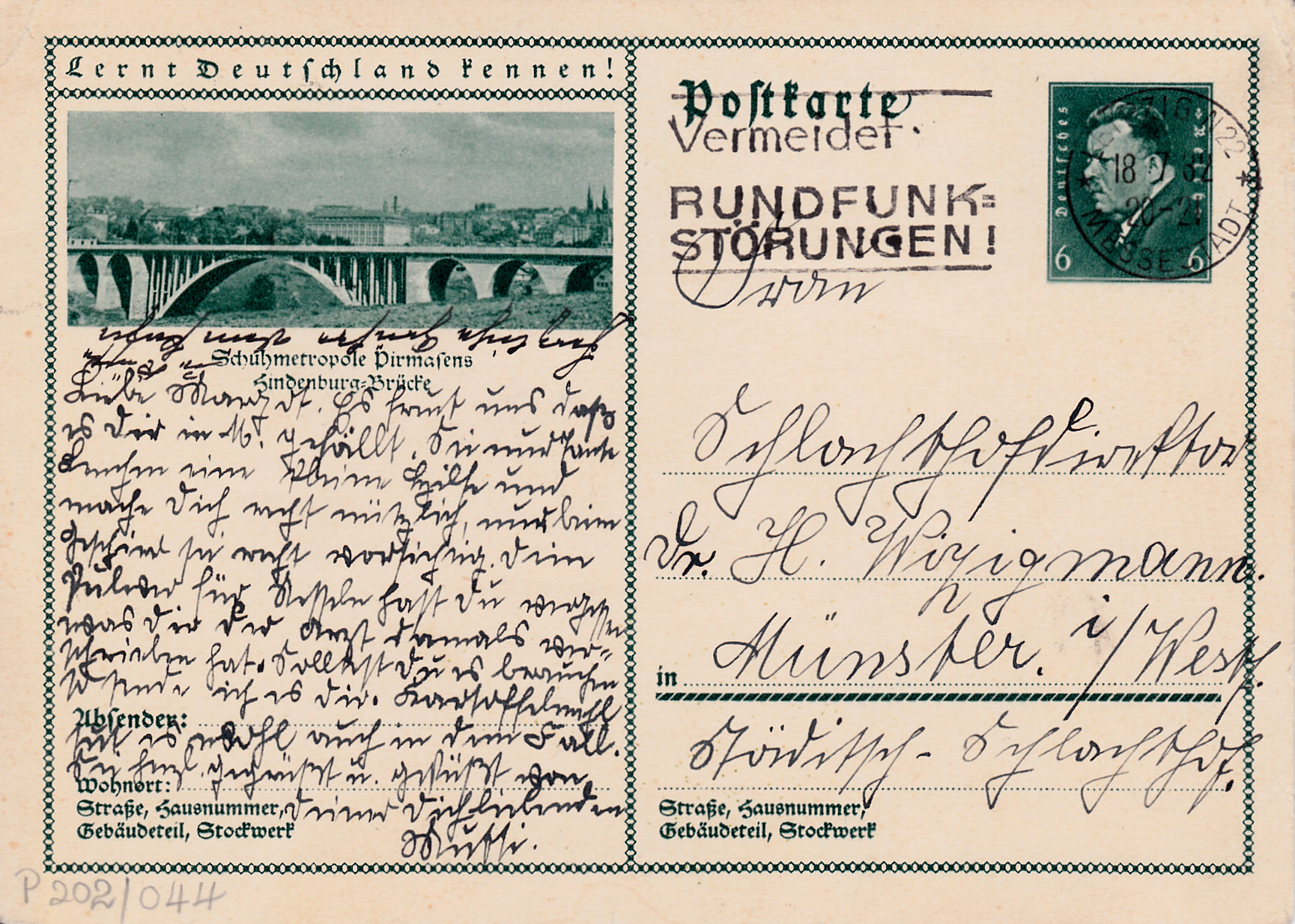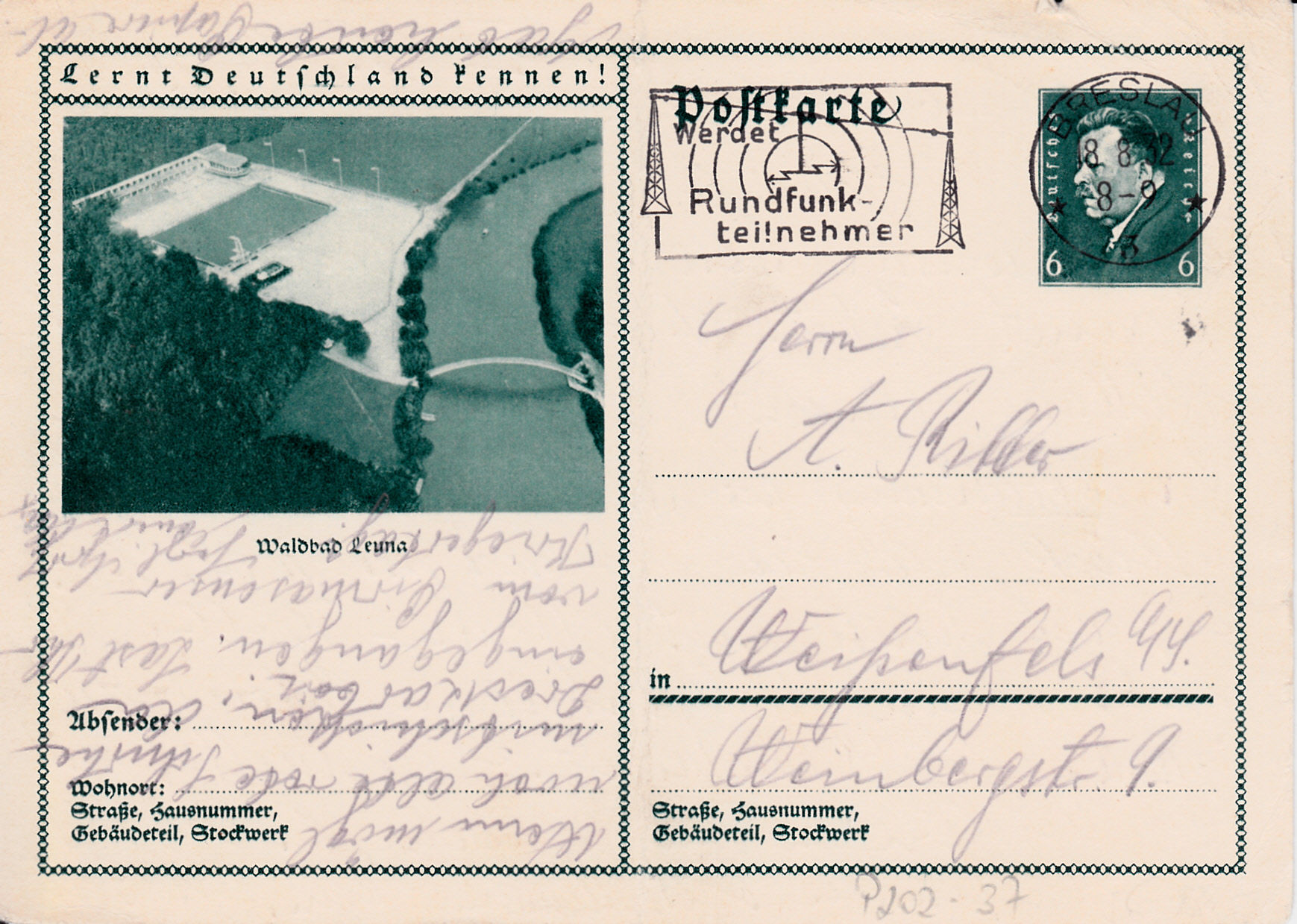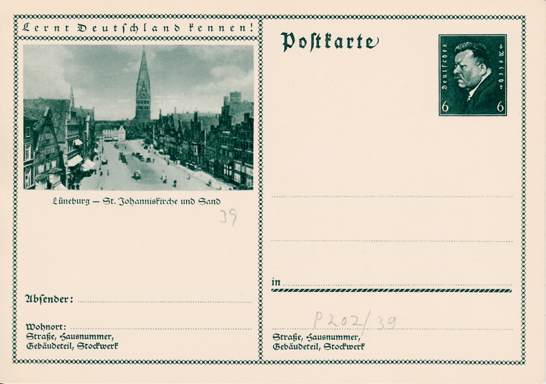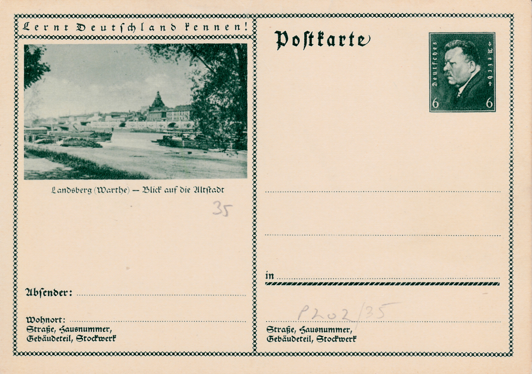 Auf dieser Karte (MiNr P 202/35) zeigt ein Foto einen Blick auf die Altstadt von Landsberg an der Warthe. Heute ist Landsberg an der Warthe (poln.: Gorzów Wielkopolski) eine Großstadt in der polnischen Woiwodschaft Lebus.