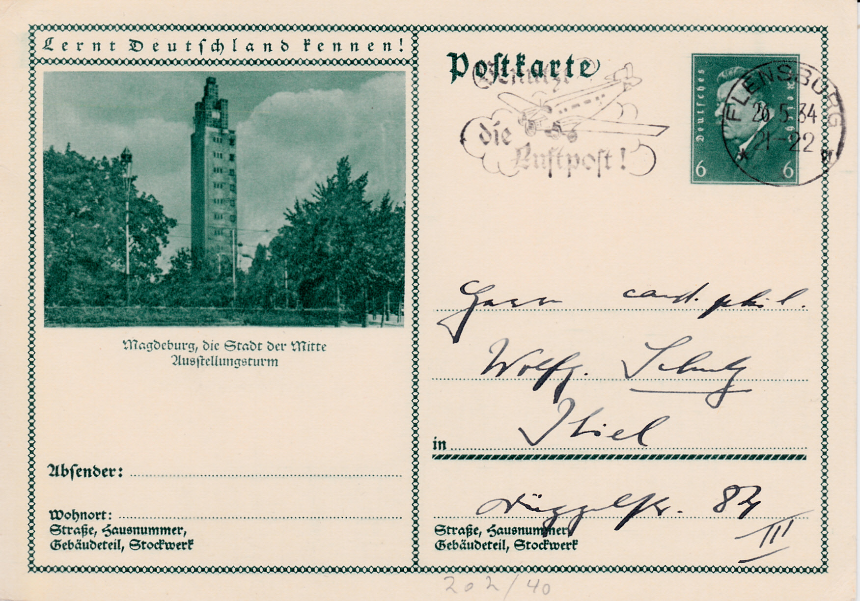 Der Aussichtsturm im Rotehornpark in Magdeburg wurde zur Deutschen Theaterausstellung 1927 errichtet. Auf dieser Bildpostkarte (MiNr P 202/40) wird ein Foto des Turmes gezeigt. Das Ausstellungsgelände wurde im 2. Weltkrieg zerstört.