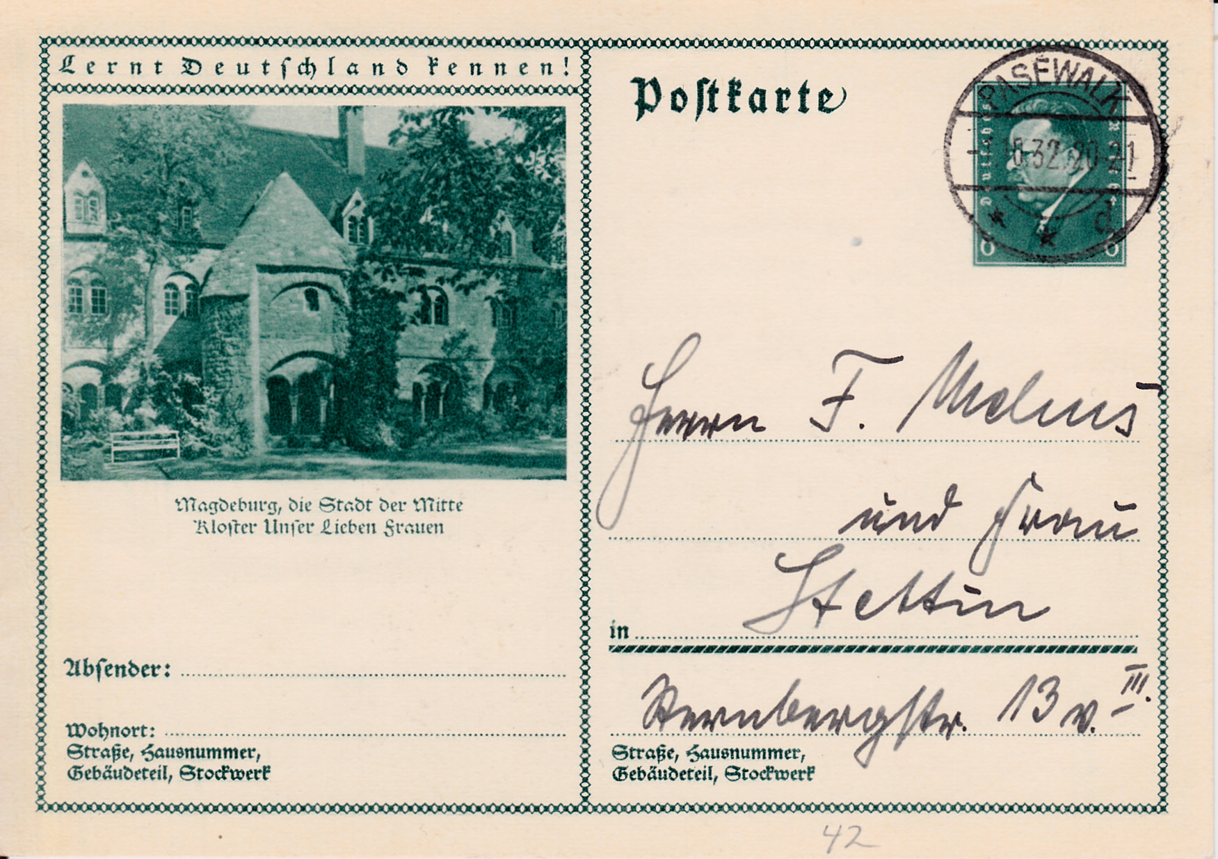 Aller guten Dinge sind drei: Es gibt noch eine dritte Karte (MiNr P 202/42) mit einer Ansicht aus Magdeburg; sie zeigt das Kloster "Unser lieben Frauen".