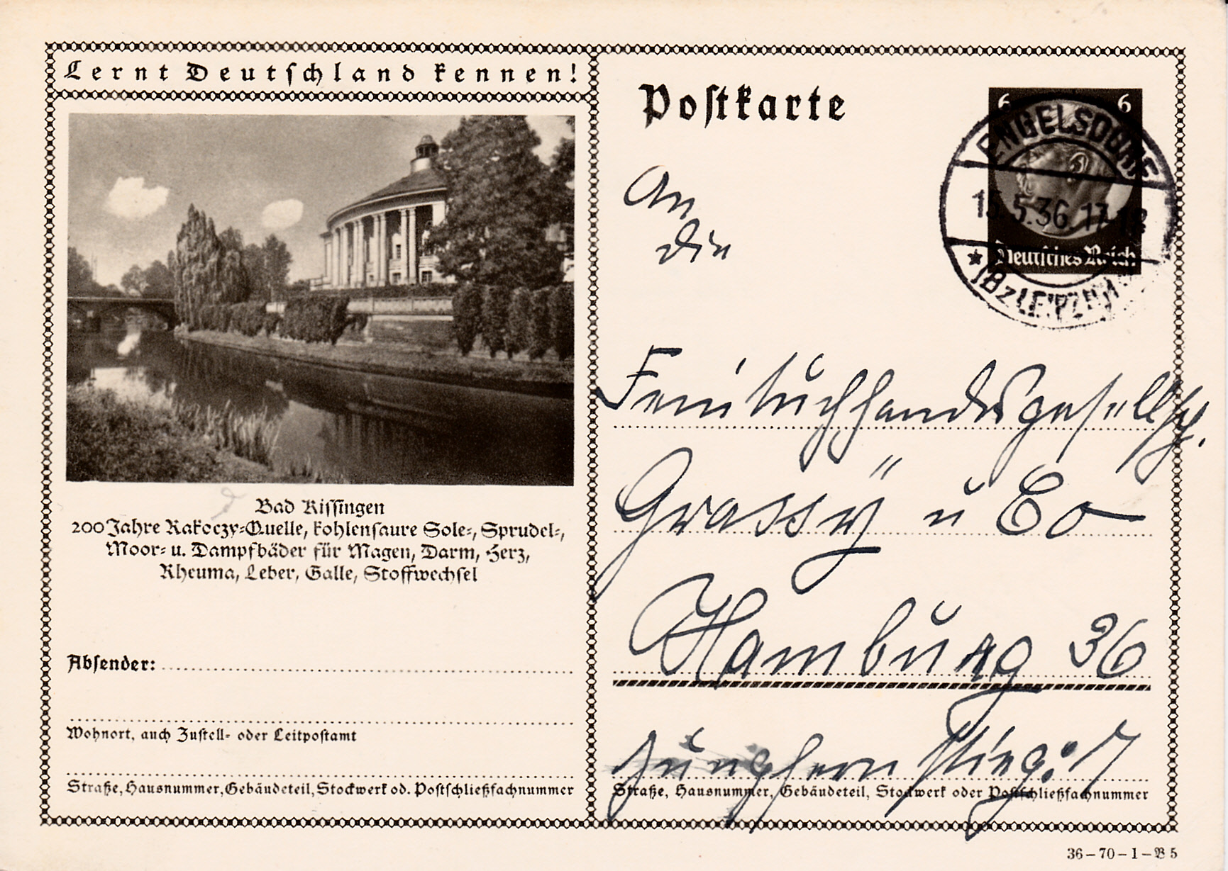 Auf dem Foto dieser Karte (Serie 70 Bild 5) sehen wir den Regentenbau in Bad Kissingen. Dieses Foto wurde bereits 1934 auf der Karte MiNr P 232/61 gezeigt.