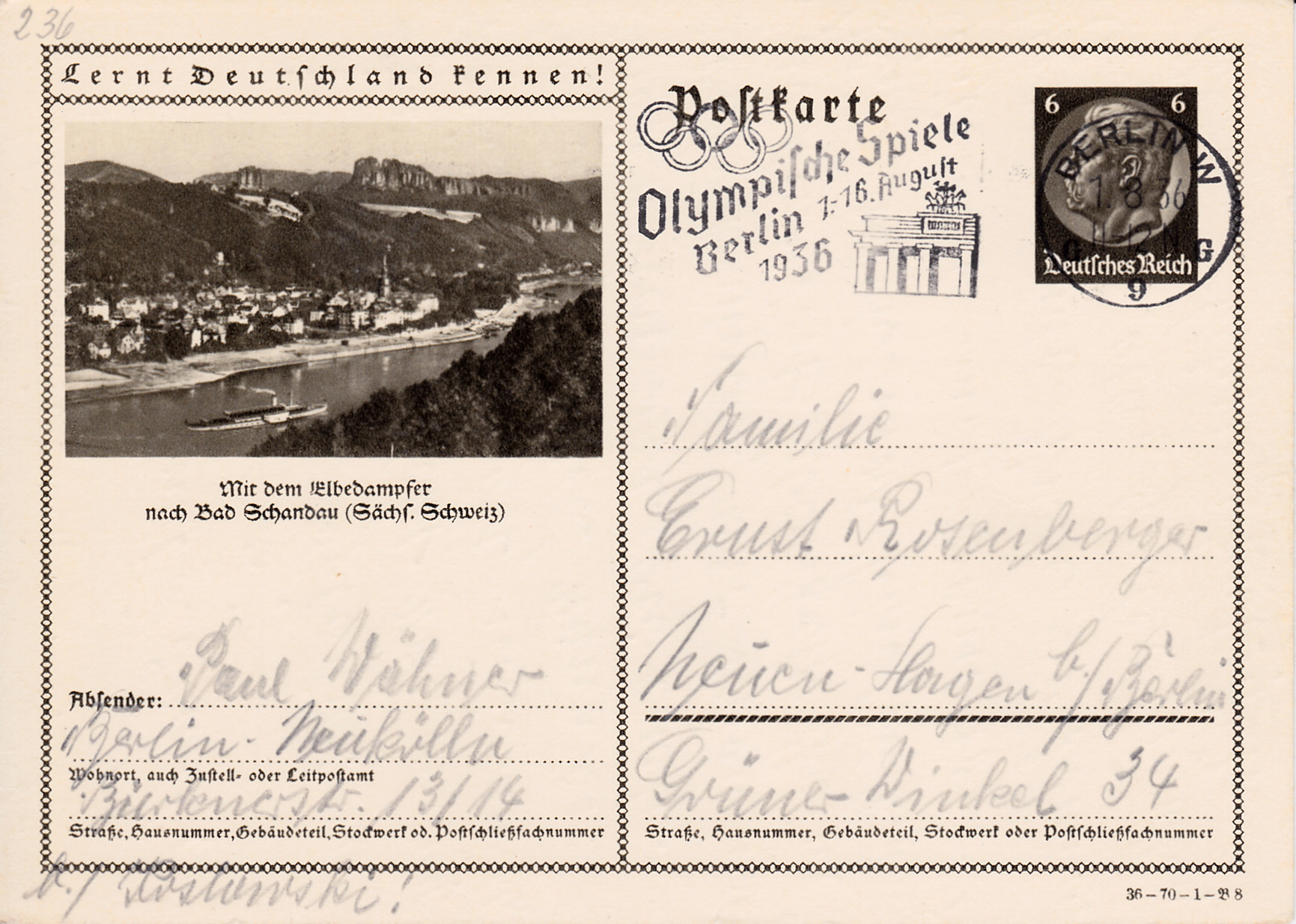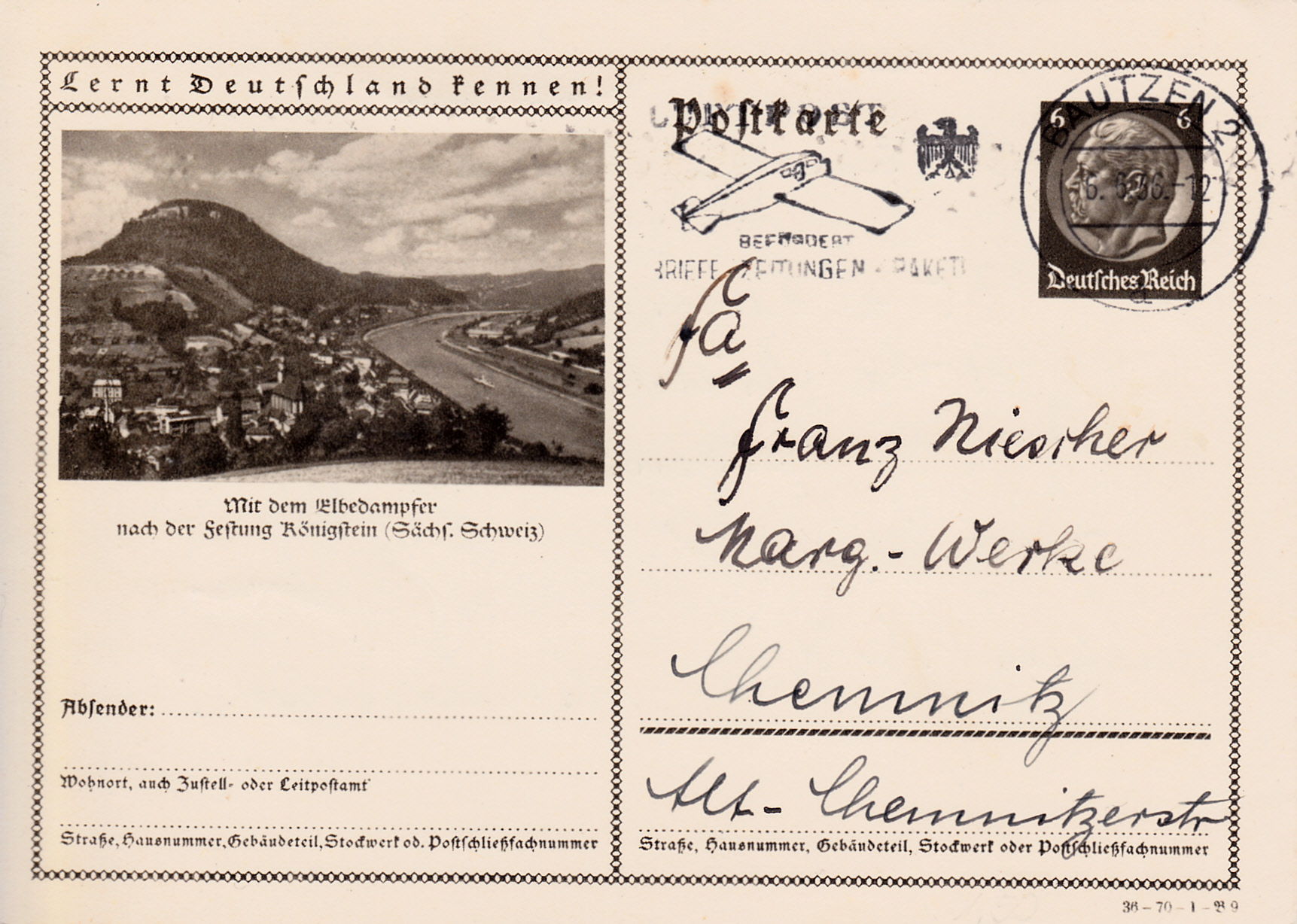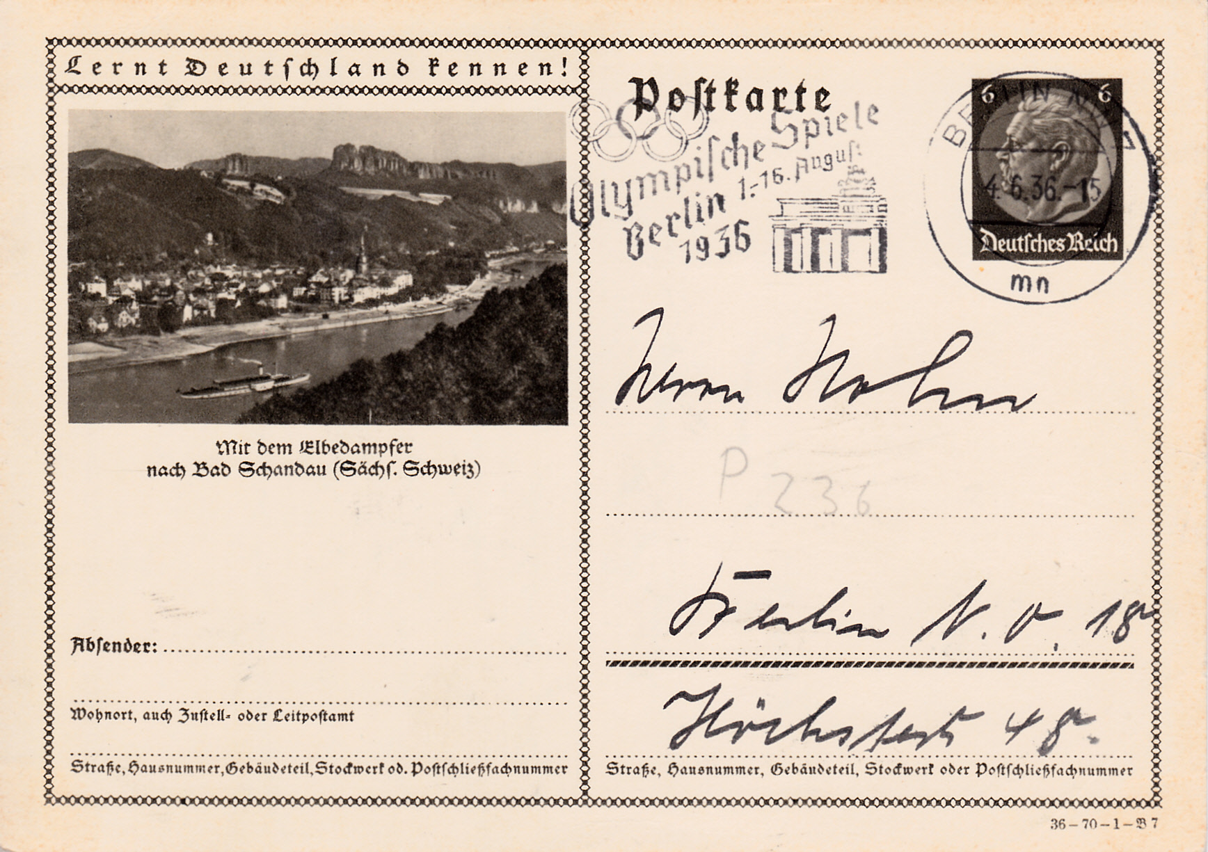 Auch in der Serie des Jahres 1936 gibt es eine Karte (Serie 70 Bild 7) dem in den Vorjahren bereits benutzten Foto, das für eine Fahrt mit einem Elbdampfer nach Bad Schandau wirbt.