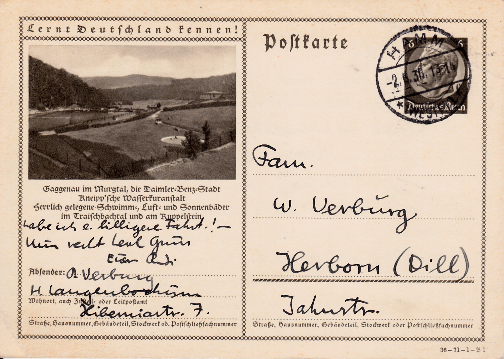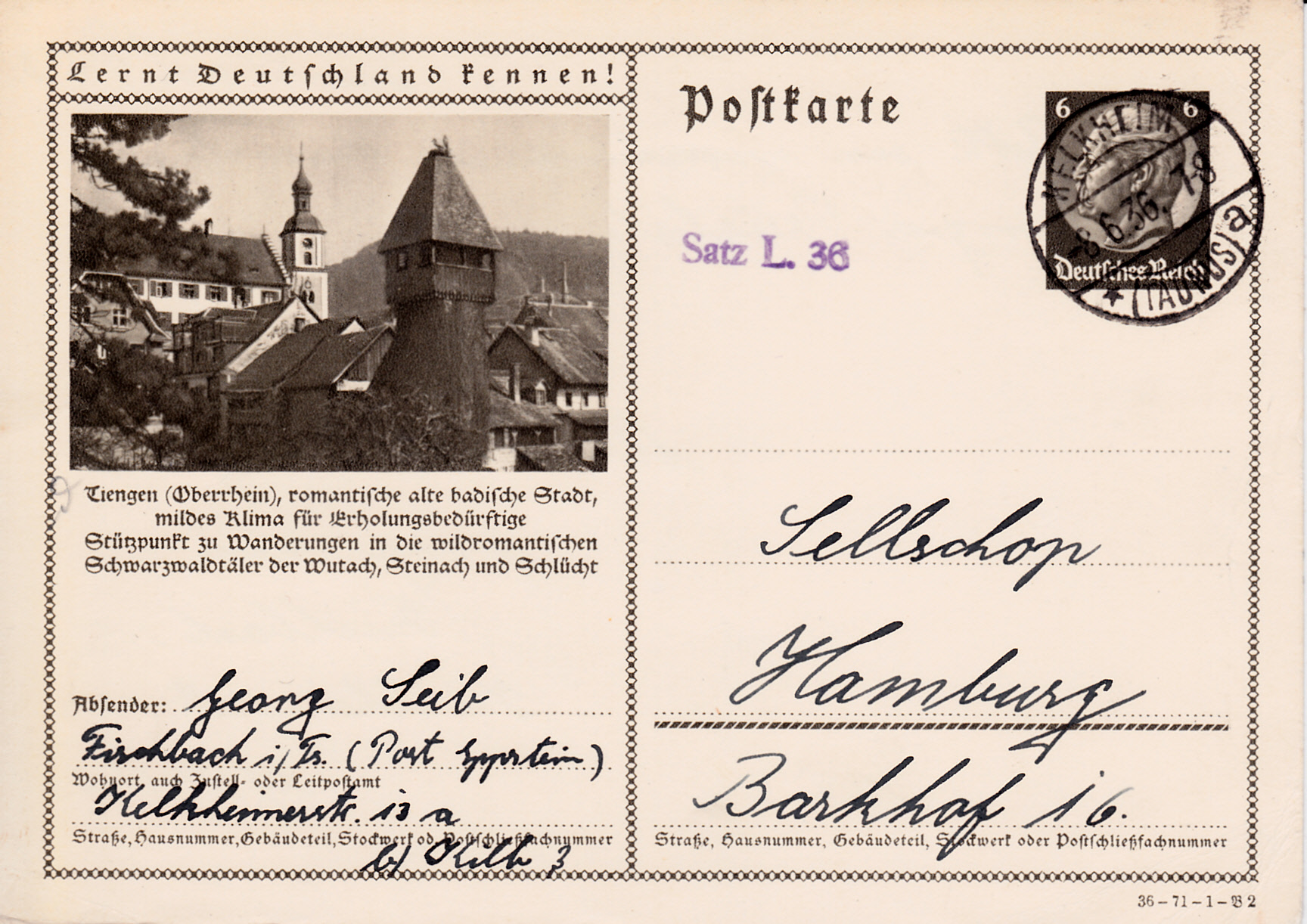 Tiengen am Oberrhein (am 1. Januar 1975 wurden die beiden Städte Waldshut und Tiengen/Hochrhein mit der Gemeinde Gurtweil zur neuen Stadt Waldshut-Tiengen vereinigt) wirbt mit der Karte (Serie 71 Bild 2) für sein mildes Klima und Wanderungen im Schwarzwald