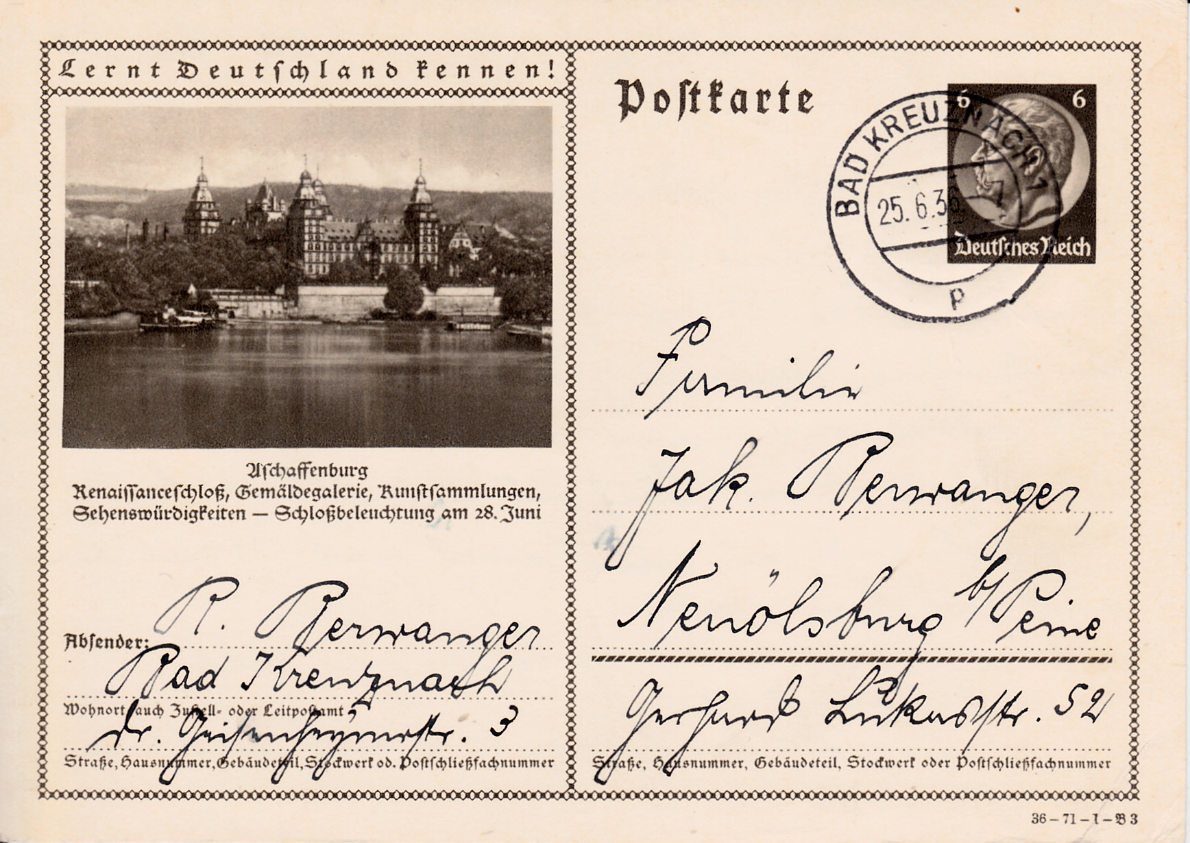 Aschaffenburg zeigt auf einer Karte (Serie 71 Bild 3) das Schloss Johannisburg, das Wahrzeichen der Stadt, und wirbt für die Schlossbeleuchtung am 28. Juni 1936.