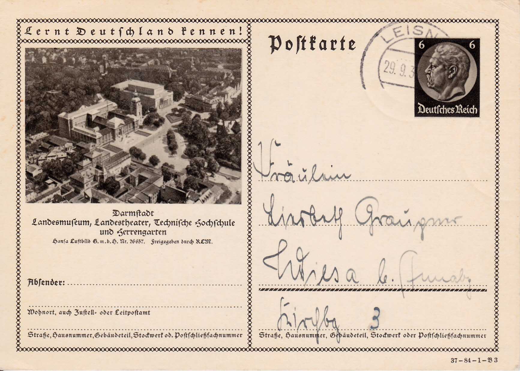 Auf einer Karte 1937 (Serie 84 Bild 3) sehen wir ein Luftbild von Darmstadt mit Landesmuseum, Landestheater, Technischer Hochschule und dem Herrengarten.