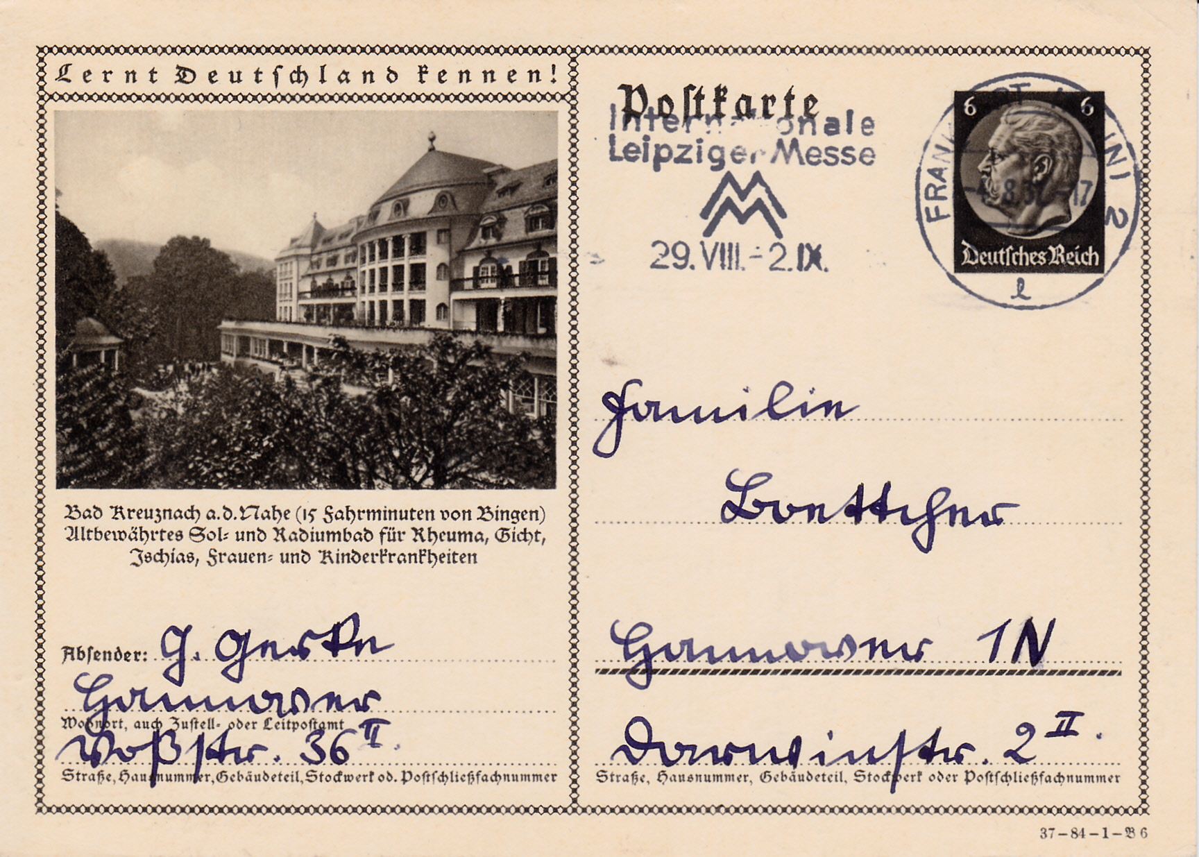 Bad Kreuznach zeigt auf dieser Karte (Serie 84 Bild 6) das Parkhotel Kurhaus in Bad Kreuznach, eine schlossartige Vierflügelanlage (1913, Architekt Emanuel von Seidl, München) . Für 14 Monate, vom 2. Januar 1917 bis zum 8. März 1918, war es der Sitz des Großen Hauptquartiers des Deutschen Kaiserreiches. Im Kurhaus selbst nahm der Kaiser Wilhelm II. seinen Wohnsitz.