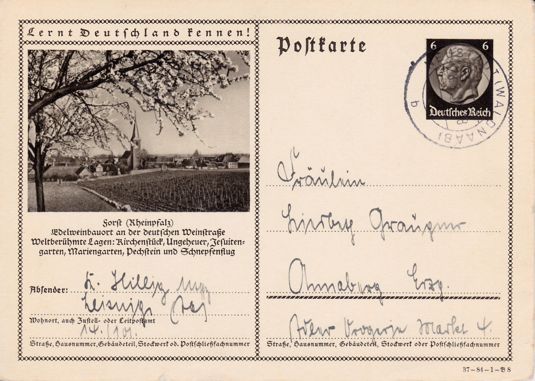 Forst (Rheinpfalz) bildet auf dieser Karte (Serie 84 Bild 8) ein Foto mit einem Wingert und einem Blick auf Forst ab. Es wird außerdem für ein paar Forster Weinlagen im Text geworben.