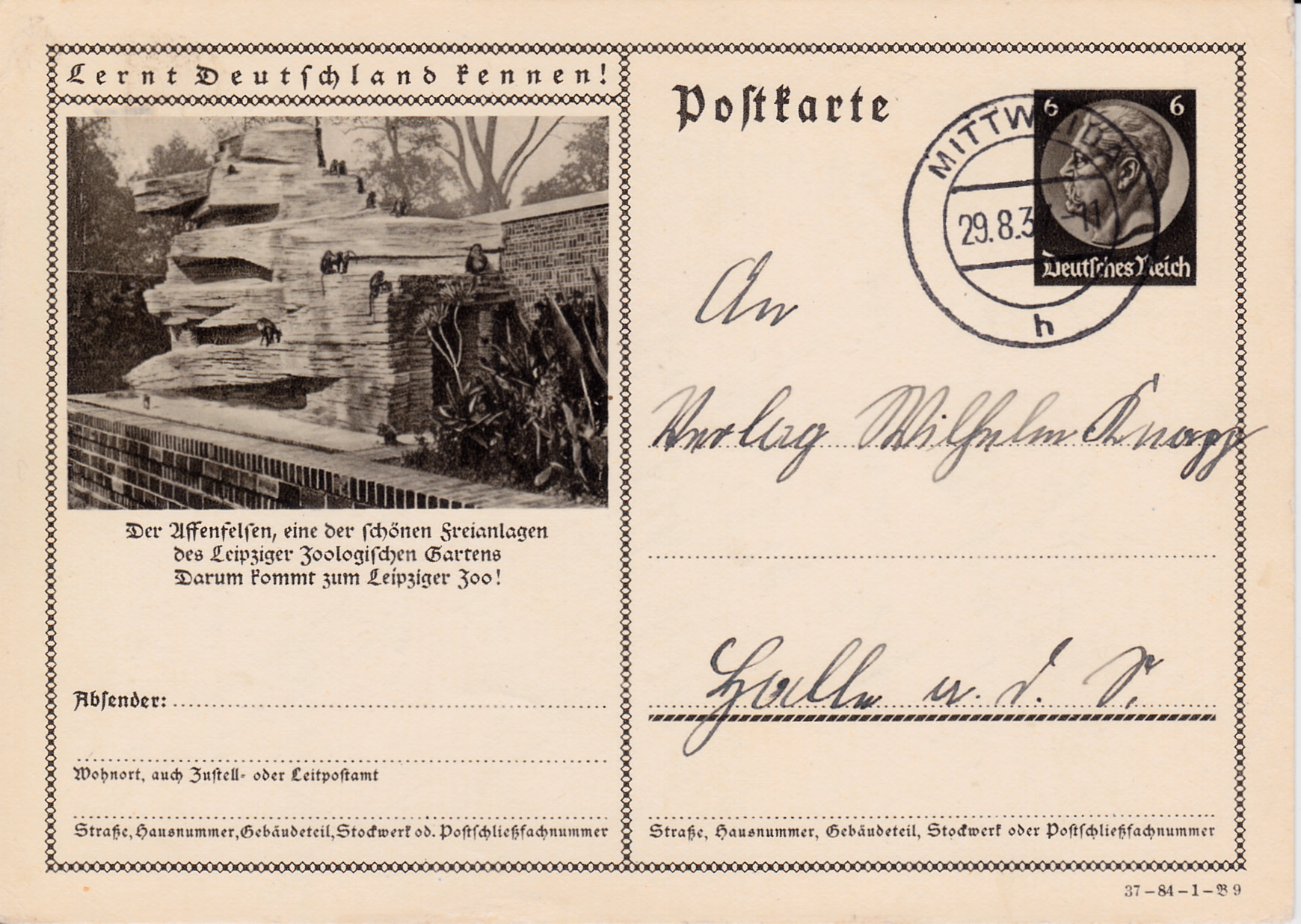 Der Leipziger Zoo wirbt 1937 auf dieser Karte (Serie 84 Bild 9) mit einem Foto mit dem Affenfelsen für einen Besuch im Zoologischen Garten Leipzig.