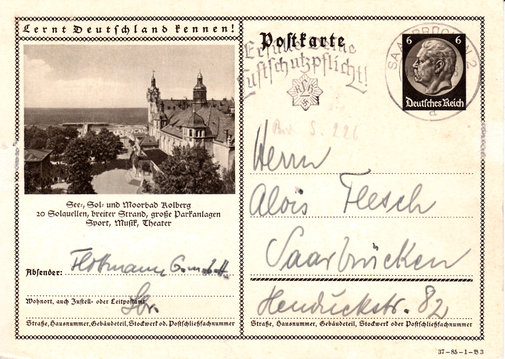 Kolberg (heute Kołobrzeg) zeigte auch 1937 auf dieser Karte (Serie 85 Bild 3) ein bereits aus dem Vorjahr bekanntes Foto mit dem Strandschloss (Kurhaus).