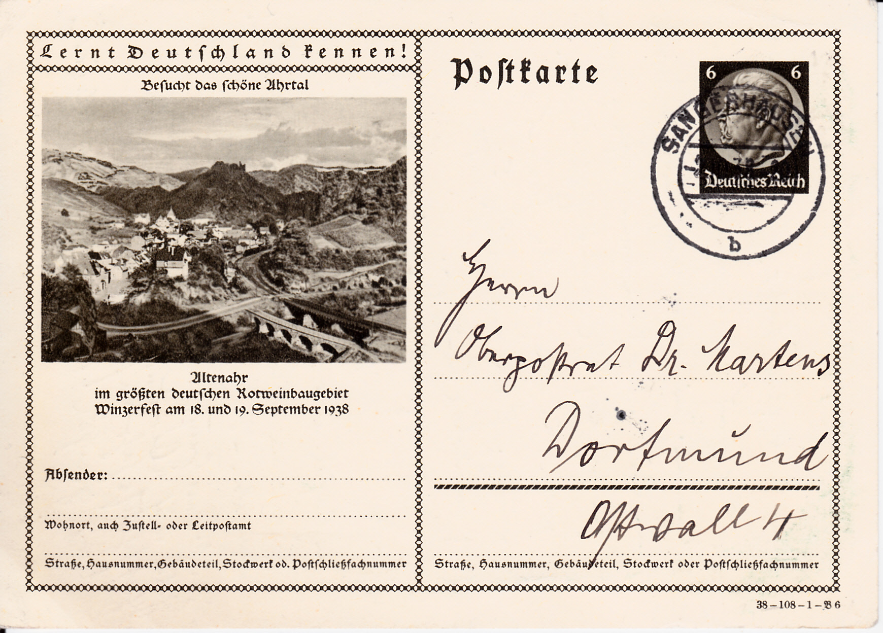 Altenahr wirbt auf dieser Karte (Serie 108 Bild 6) für sein Winzerfest am 18. und 19. September 1938.