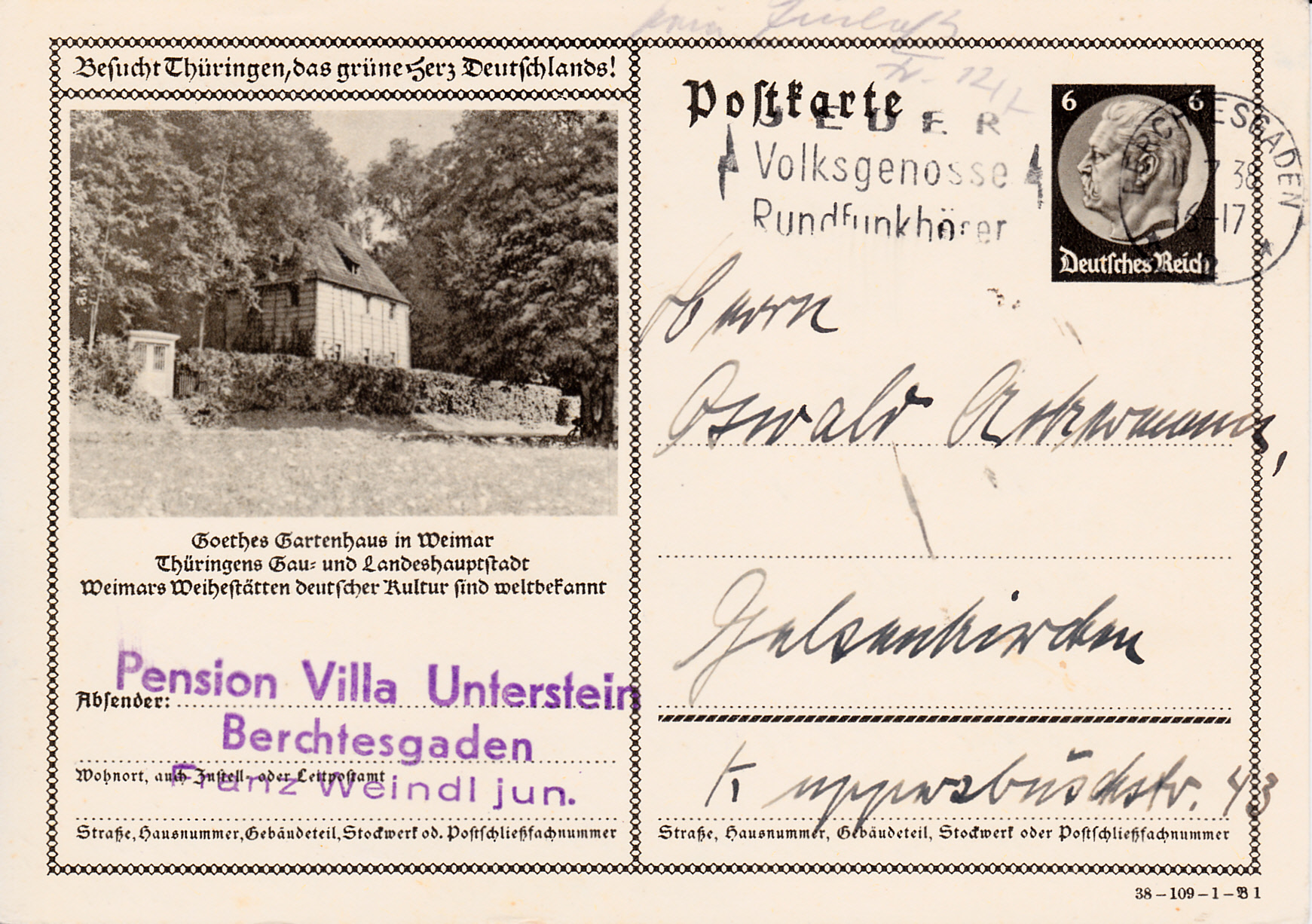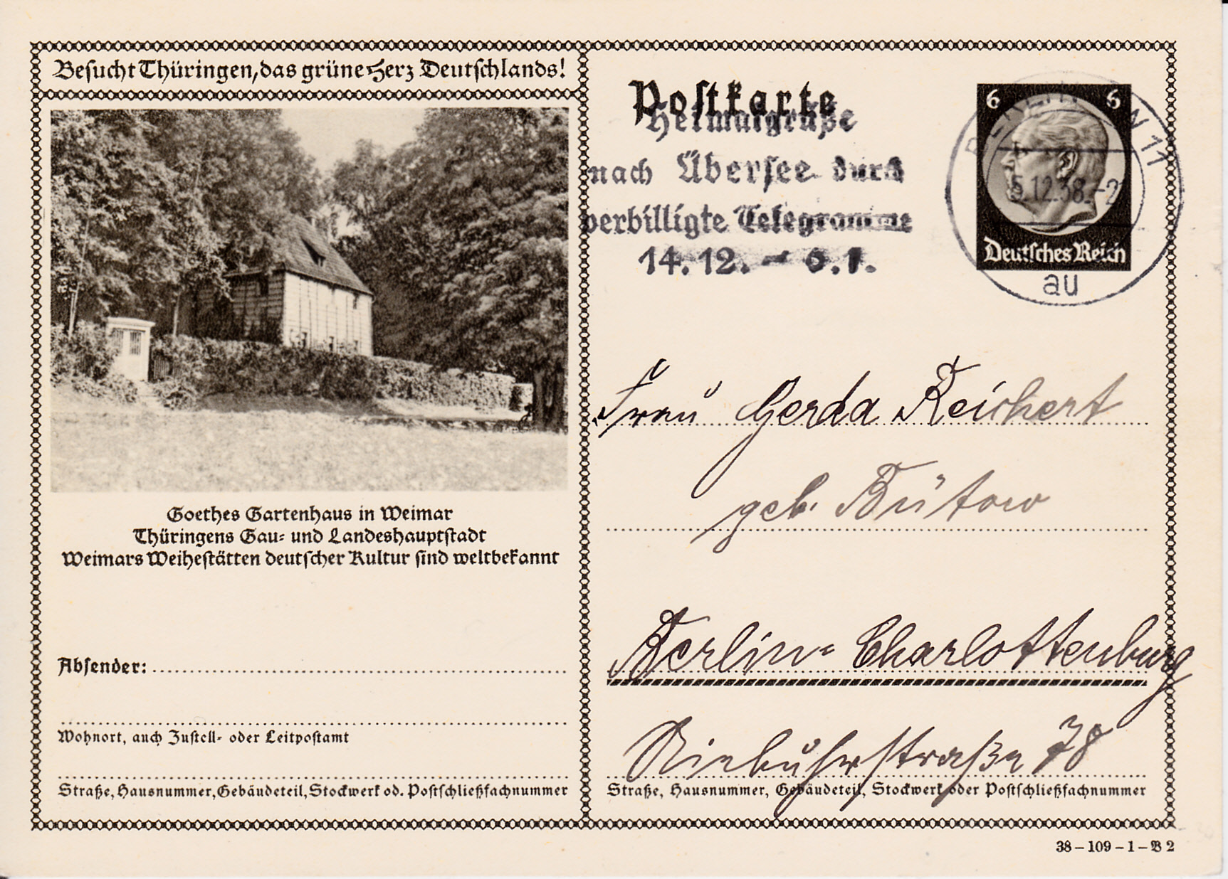 Auf dieser Karte (Serie 109 Bild 1) wird Goethes Gartenhaus gezeigt. Goethes Gartenhaus liegt im Park an der Ilm zu Weimar und war eine Wohn- und Arbeitsstätte Johann Wolfgang von Goethes. Seit 1998 gehört es als Teil des Ensembles "Klassisches Weimar" zum UNESCO-Weltkulturerbe.