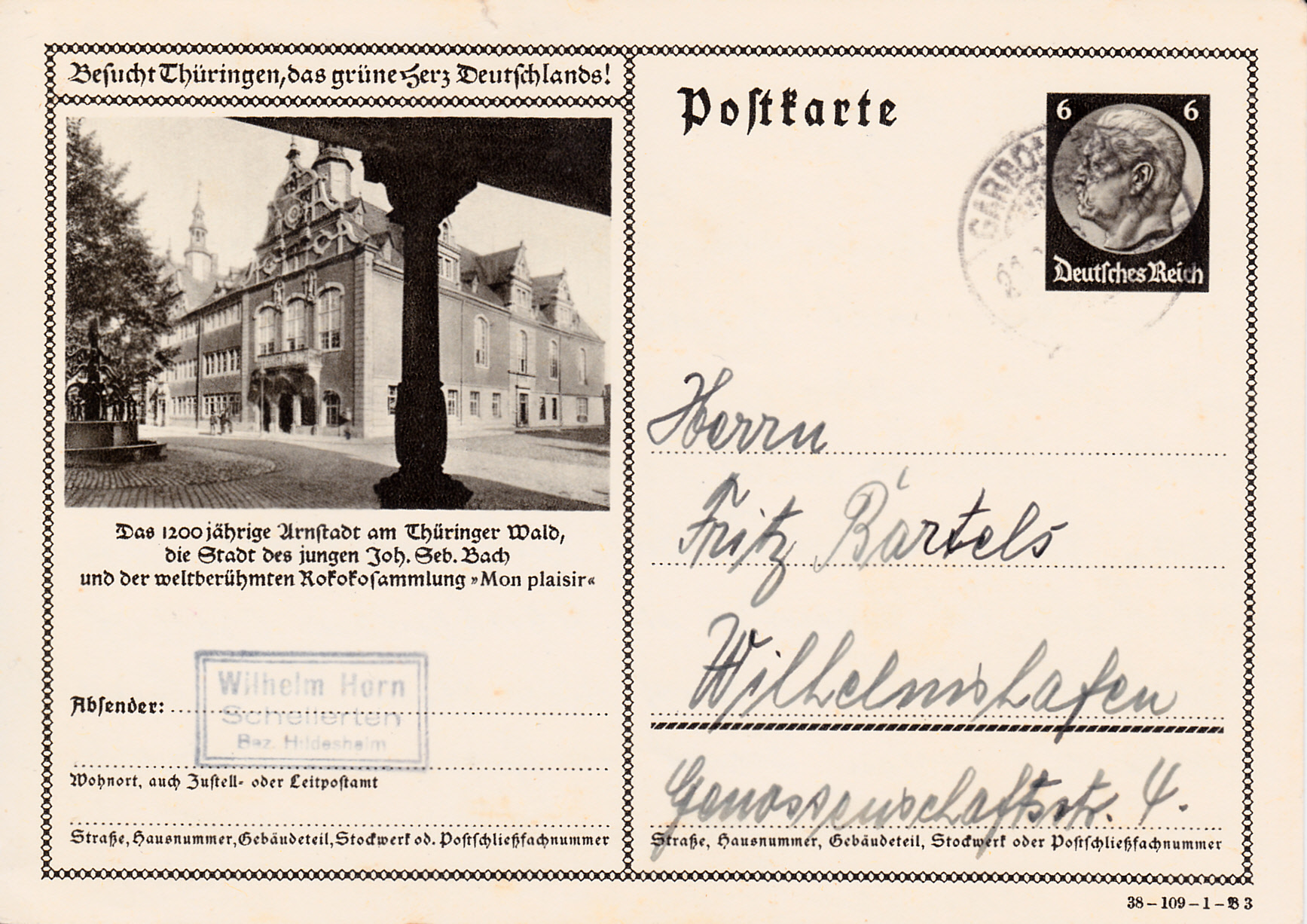Arnstadt wiederholt auf dieser Karte (Serie 109 Bild 3) den Blick auf das Rathaus aus dem Jahre 1937.