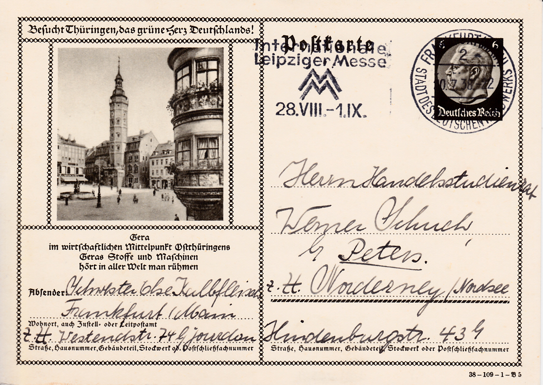 Auch das Rathaus am Markt in Gera ist 1938 erneut auf dieser Bildpostkarte (Serie 109 Bild 5) zu sehen.