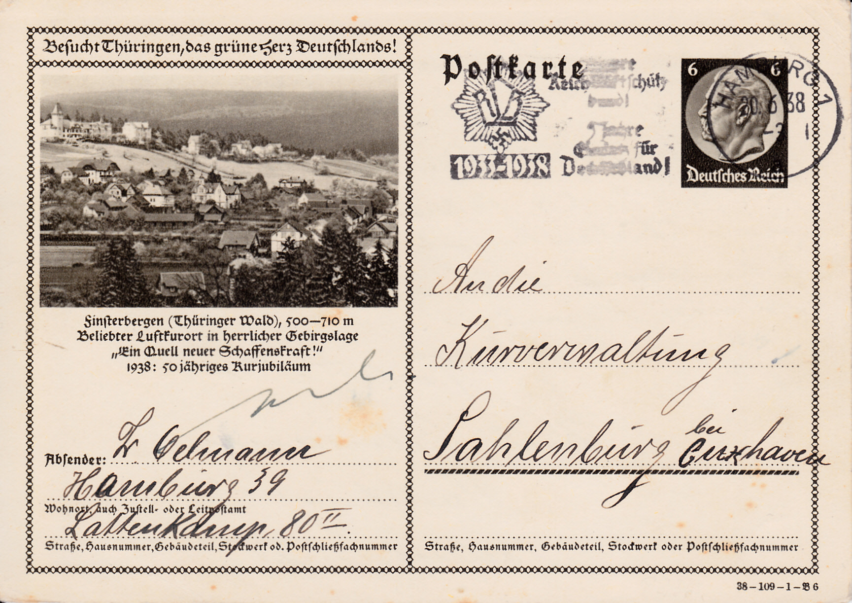 Finsterbergen im Thüringer Wald stellt sich mit einer Ansicht der Gemeinde auf dieser Karte (Serie 109 Bild 6) zum 50-jährigen Jubiläum als Kurort vor.