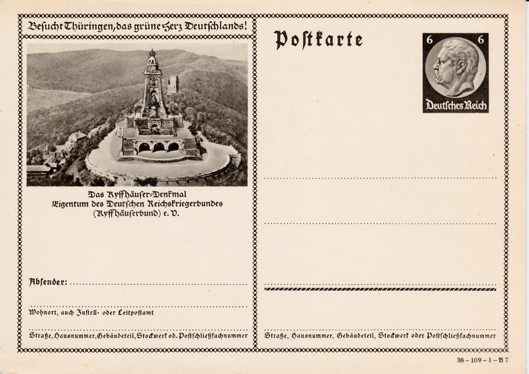 Auch das Kyffhäuserdenkmal im Kyffhäusergebirge im Gelände der ehemaligen Reichsburg Kyffhausen in der Gemarkung von Steinthaleben (Gemeinde Kyffhäuserland) im thüringischen Kyffhäuserkreis, ist nach 1937 auch wieder auf dieser Karte (Serie 109 Bild 7) abgebildet.