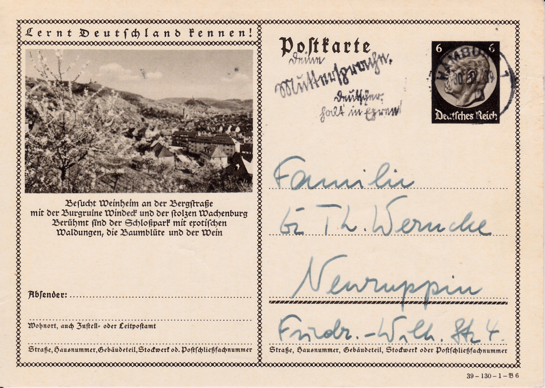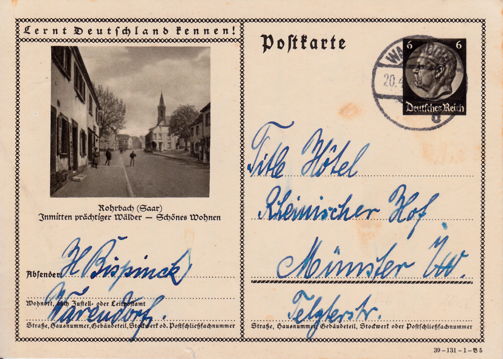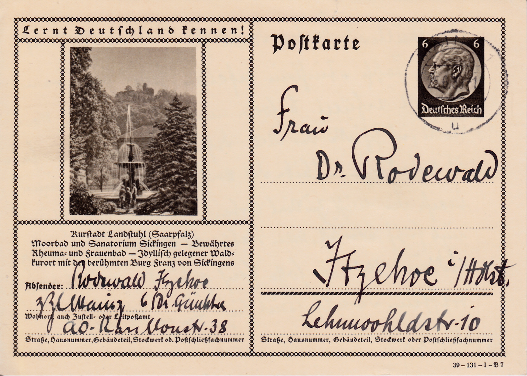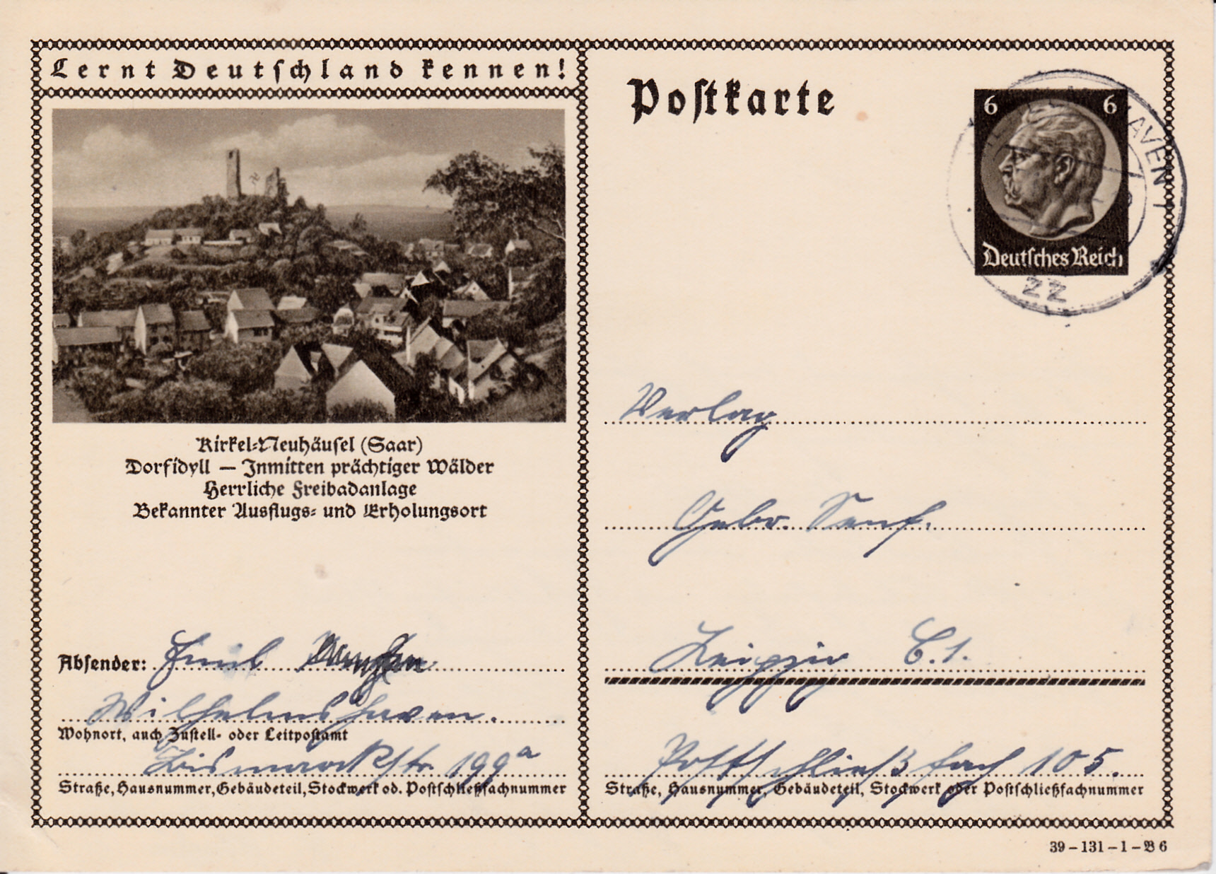 Kirkel-Neuhäusel (Saar) (war bis Ende 1973 Kirkel-Neuhäusel eine eigenständige Gemeinde; seitdem Stadtteil von Kirkel) zeigt auf dieser Karte (Serie 131 Bild 6) ein Foto mit einem Blick auf die Gemeinde und die Burg Kirkel.