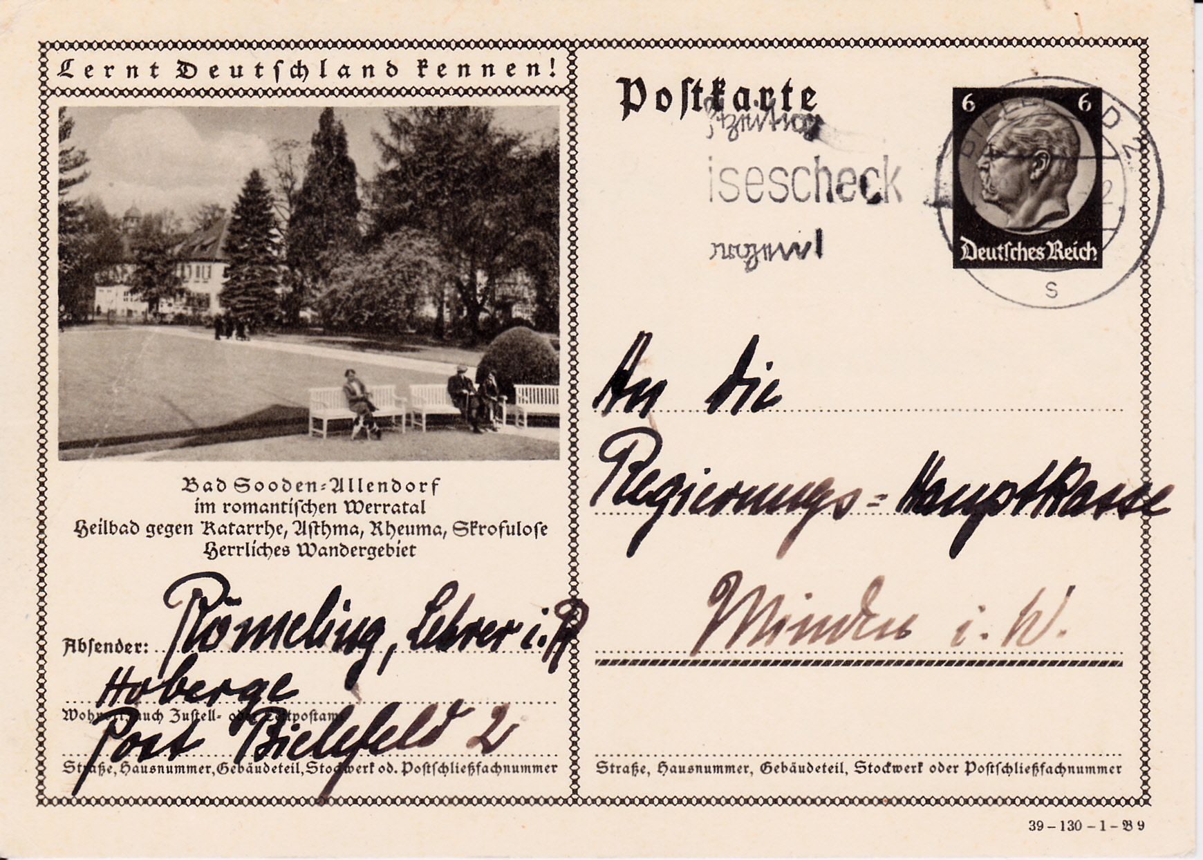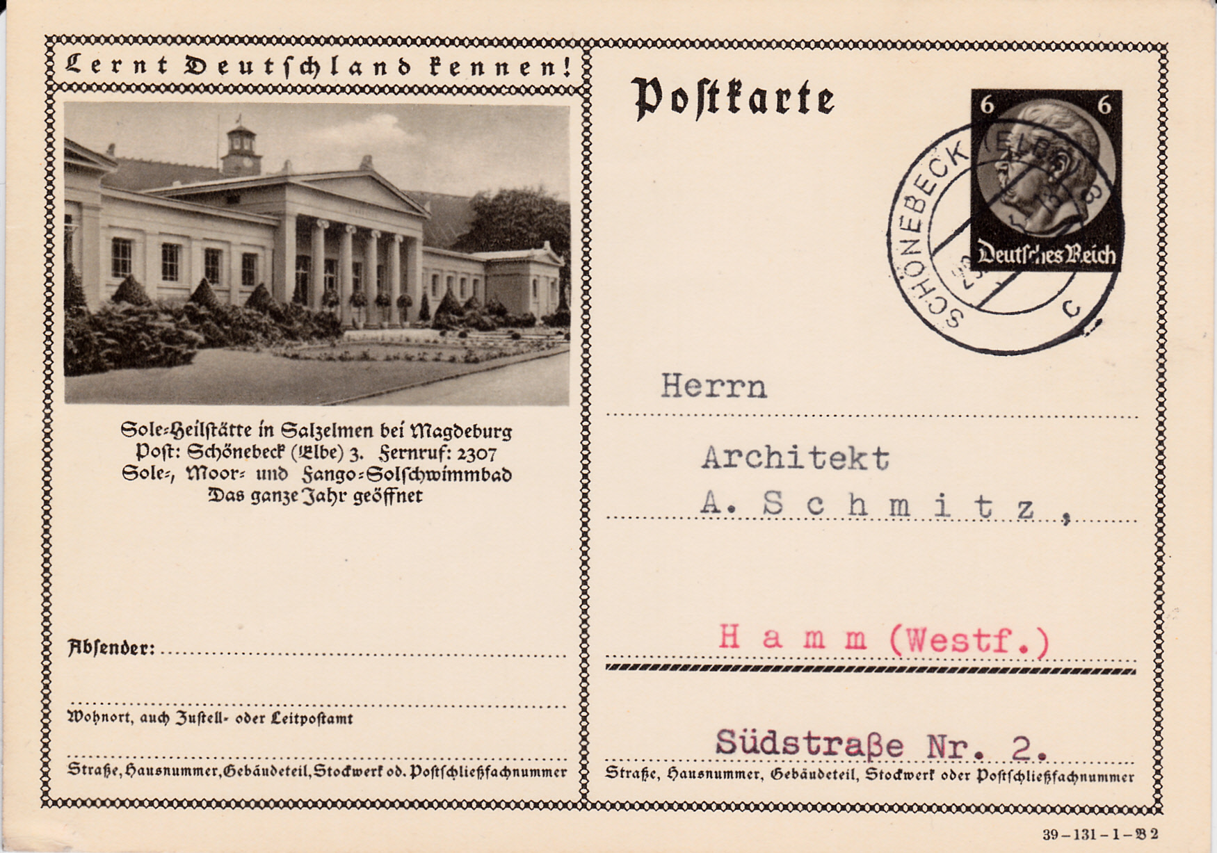 Das Foto auf dieser Karte (Serie 131 Bild 2) zeigt das Kurmittelhaus "Lindenbad" in Bad Salzelmen (seit 1932 ein Stadtteil von Schönebeck (Elbe)). Die Karte ist auch in Schönebeck gestempelt worden.