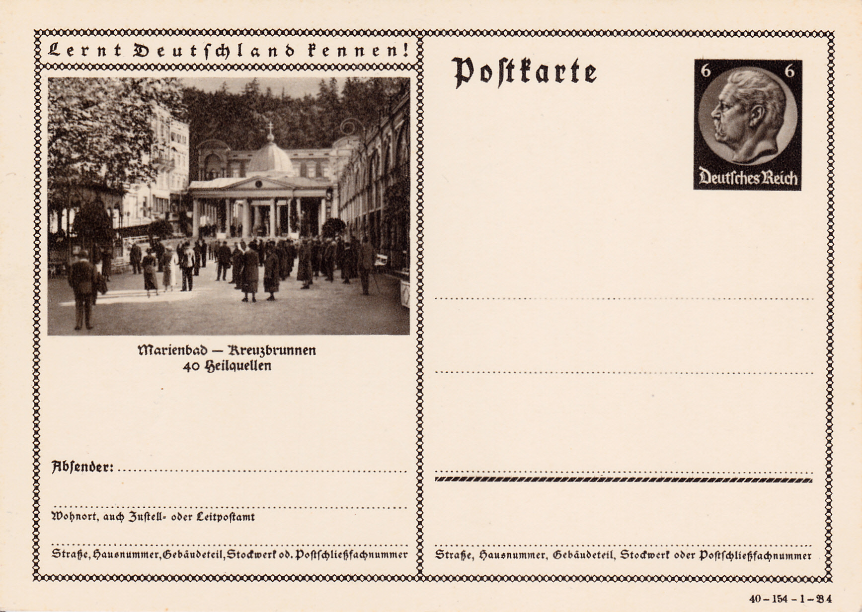 Marienbad wiederholt auf dieser Karte (Serie 154 Bild 4) das Foto aus dem Vorjahr mit dem Pavillon der Kreuzquelle an der Promenade. Marienbad heißt heute Mariánské Lázně und ist ein Kurort im Westböhmischen Bäderdreieck in Tschechien.