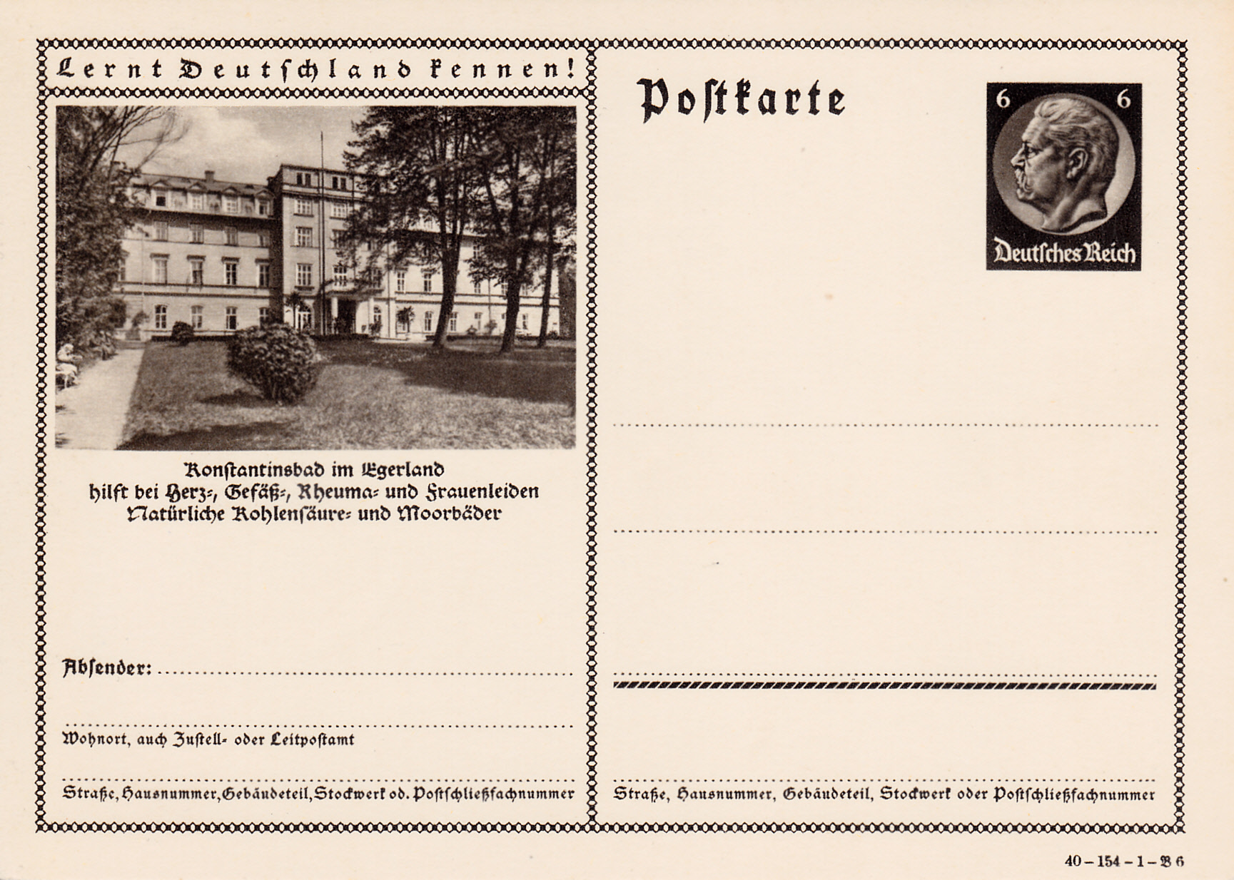 Konstantinsbad im Egerland stellt sich auf dieser Karte (Serie 154 Bild 6) als Heilbad vor. Konstantinsbad heißt heute Konstantinovy Lázně und ist eine Gemeinde mit 920 im Plzeňský kraj in Tschechien.