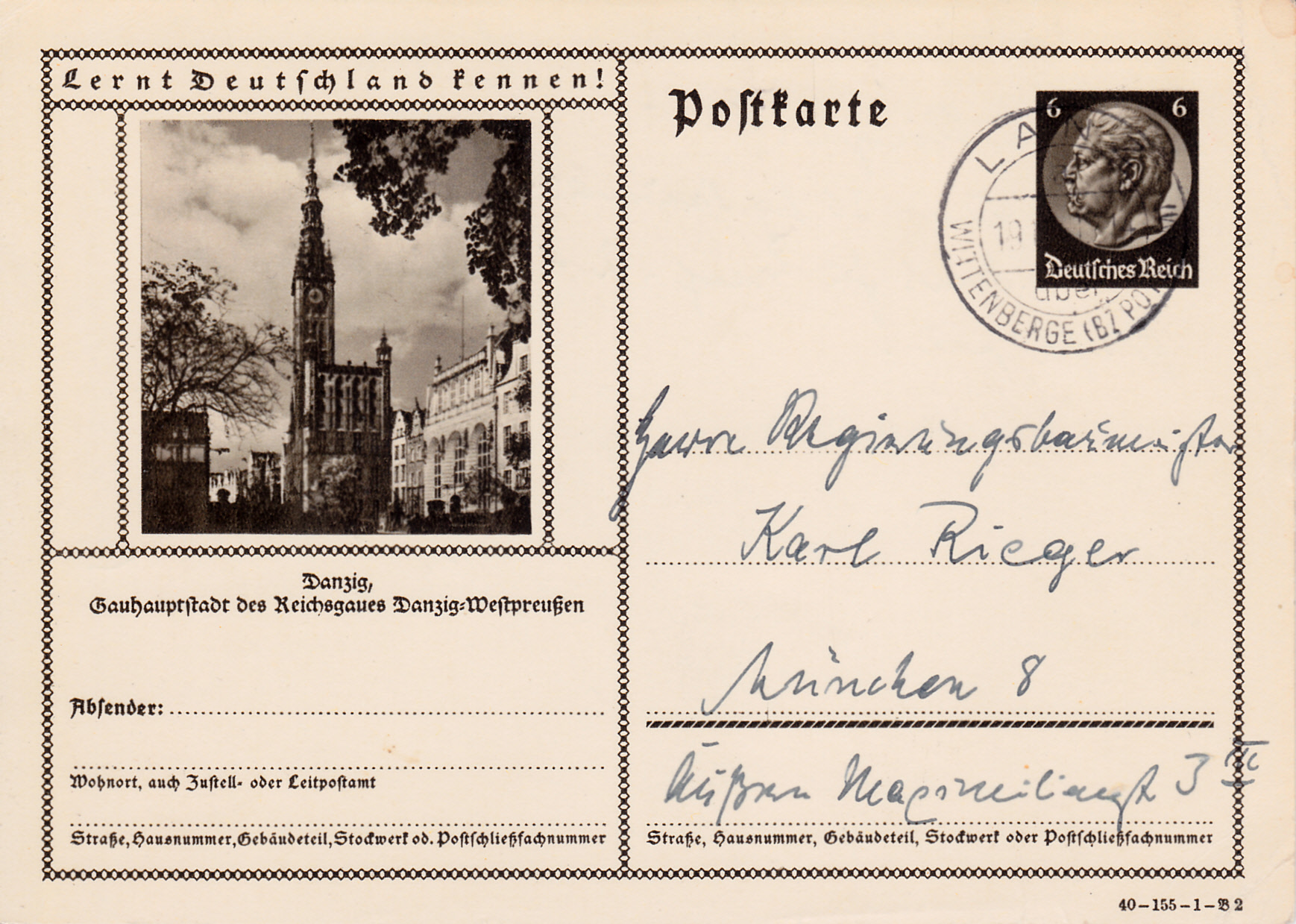Danzig zeigt auf dieser Bildpostkarte (Serie 155 Bild 2) ein Foto mit dem Rathaus in Danzig. Danzig heißt heute Gdańsk und ist die Hauptstadt der Woiwodschaft Pommern an der Ostseeküste im Norden von Polen.