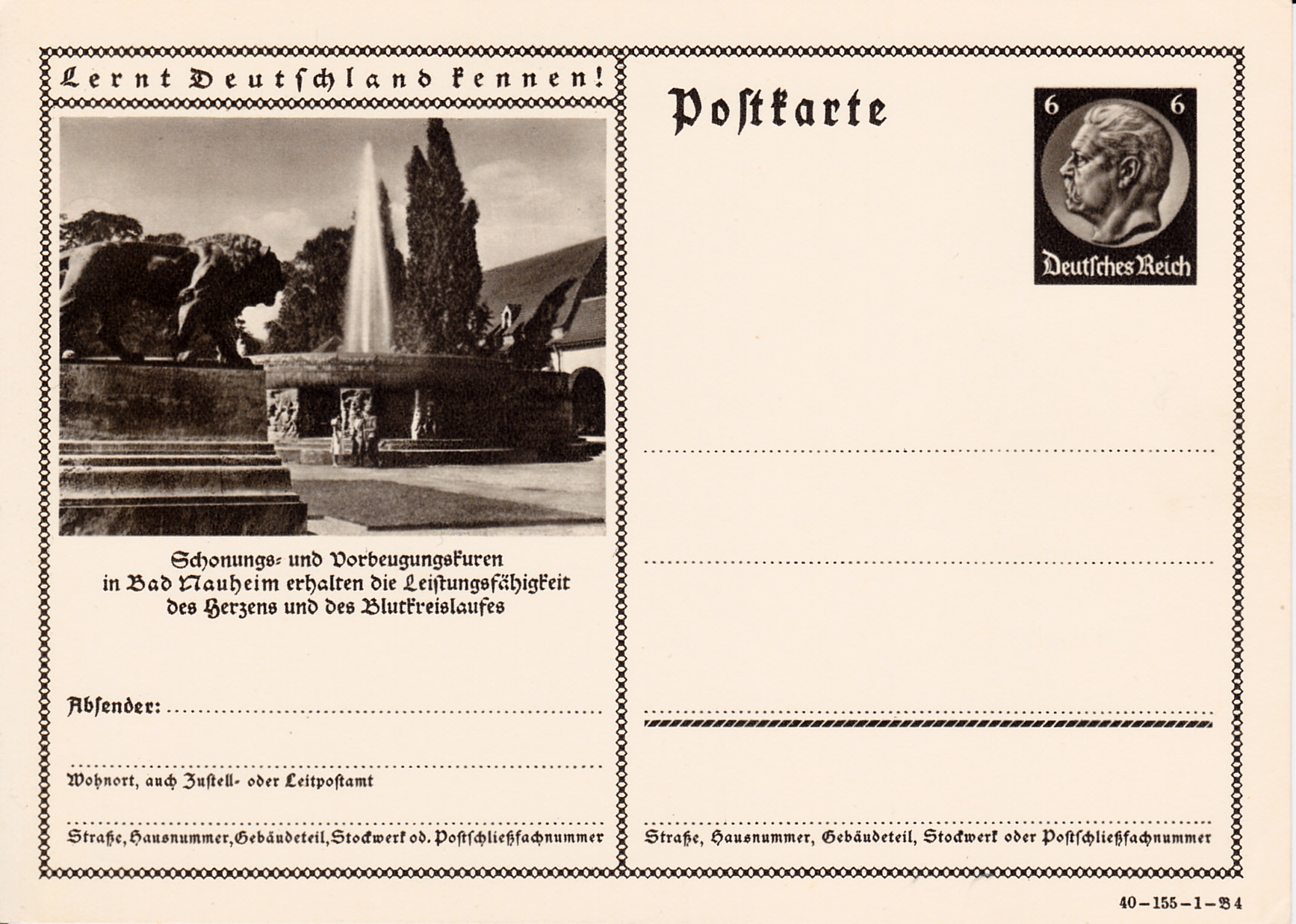 Bad Nauheim wirbt auf dieser Karte (Serie 155 Bild 4) für Schonungs- und Vorbeugungskuren zur Erhaltung der Leistungsfähigkeit des Herzens.