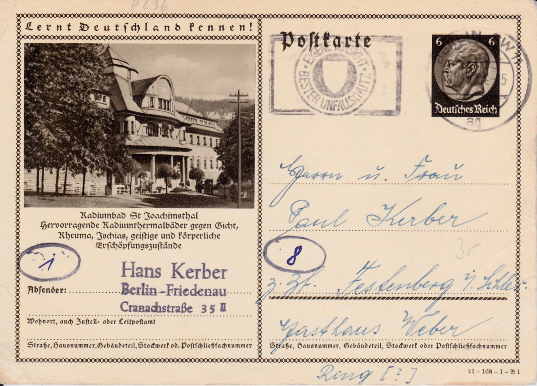 Sankt Joachimsthal wiederholt auf dieser Karte (Serie 168 Bild 2) das bereits hier aus Vorjahren bekannte Bild mit Kurhotel Radium Palace.