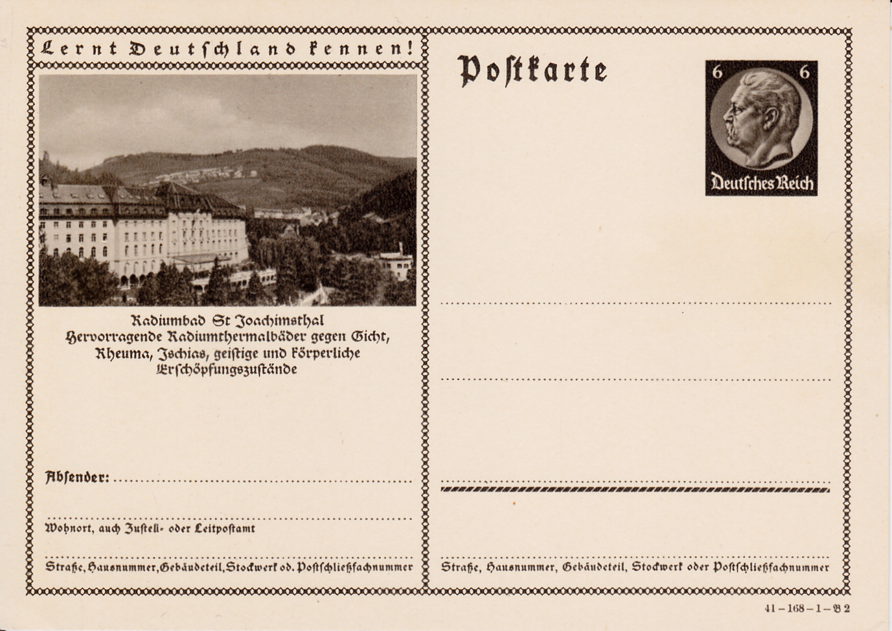 Sankt Joachimsthal wirbt dieser Karte (Serie 168 Bild 1) für seine Radiumthermalbäder. Sankt Joachimsthal heißt heute Jáchymov und ist eine Stadt in der Karlsbader Region in Tschechien.