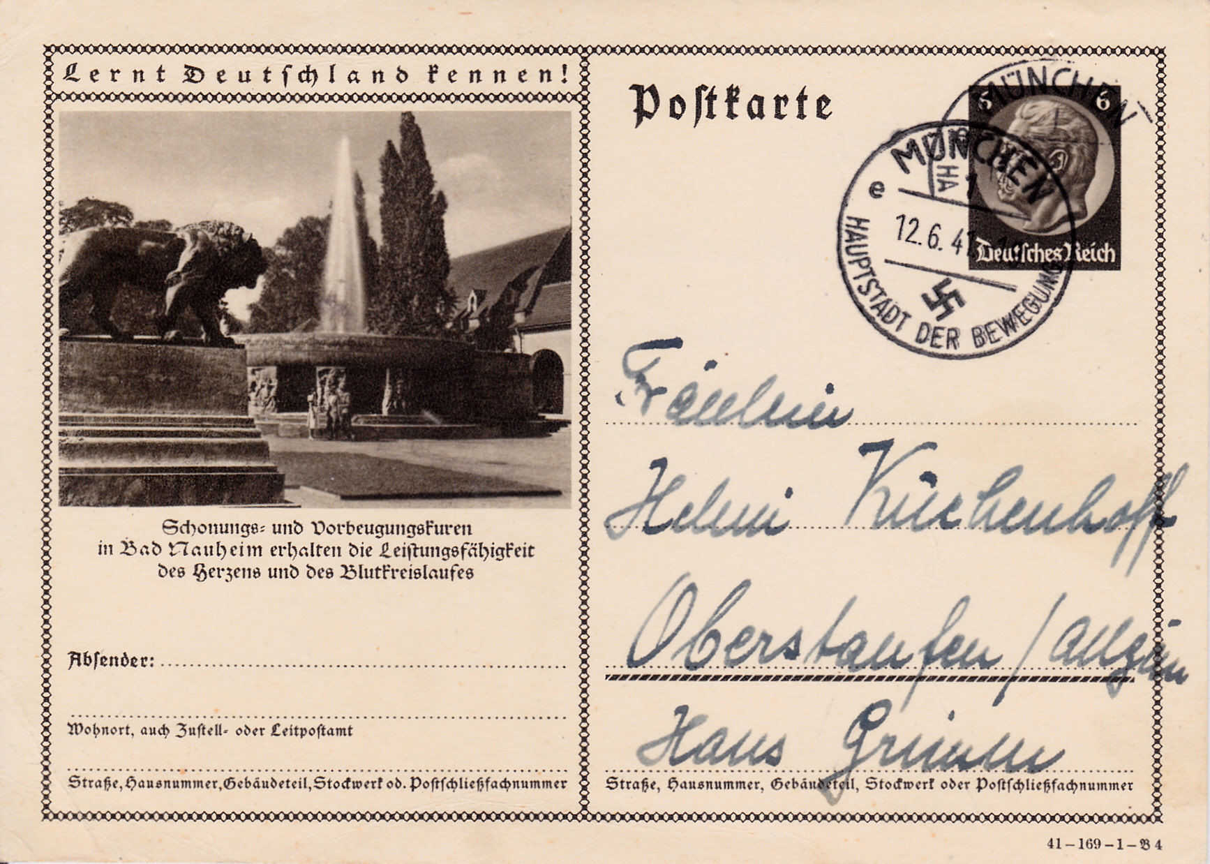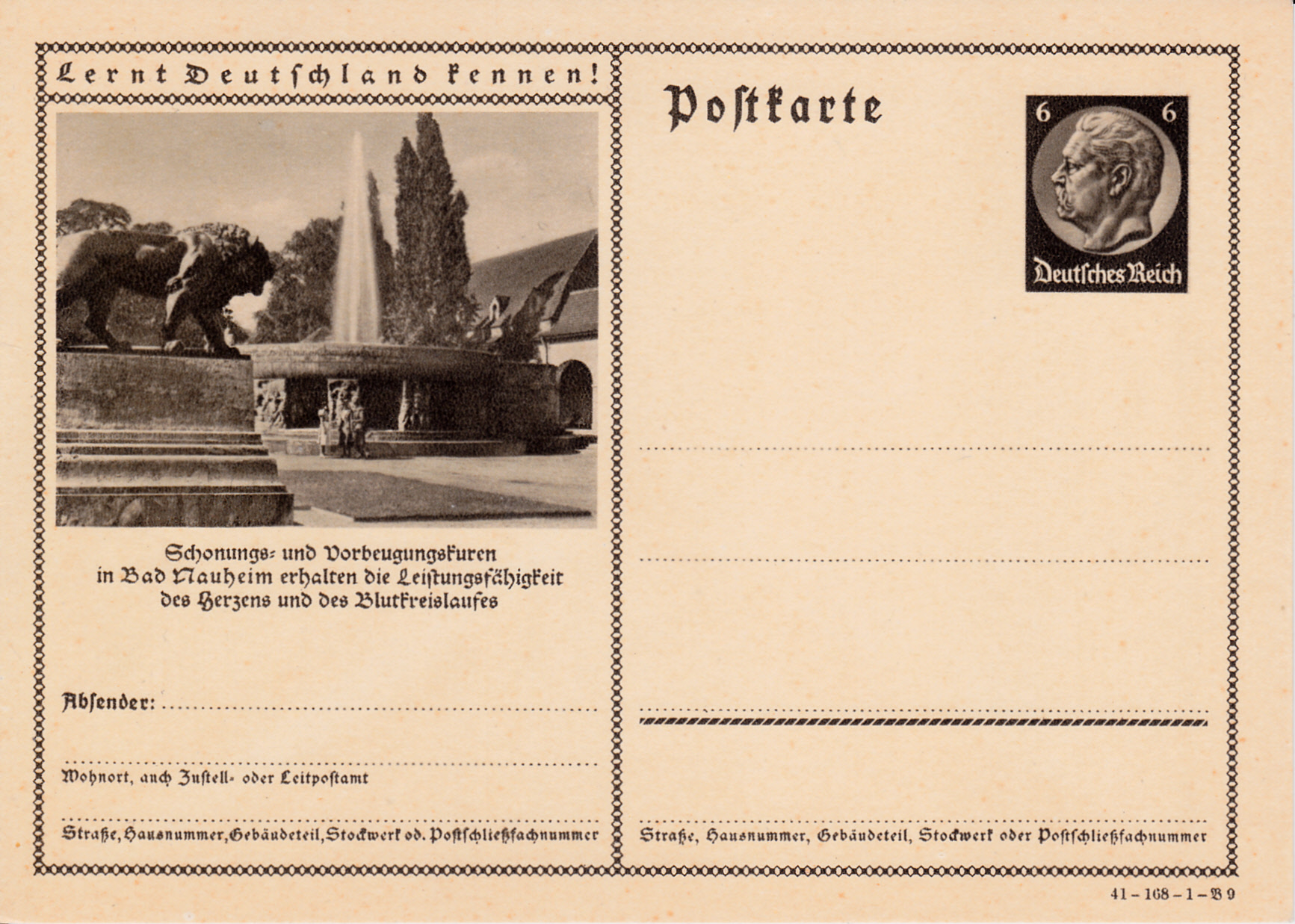 Bad Nauheim wiederholt 1941 auf dieser Karte (Serie 168 Bild 9) Bild und Text aus dem Vorjahr und wirbt so für Schonungs- und Vorbeugungskuren zur Erhaltung der Leistungsfähigkeit des Herzens.