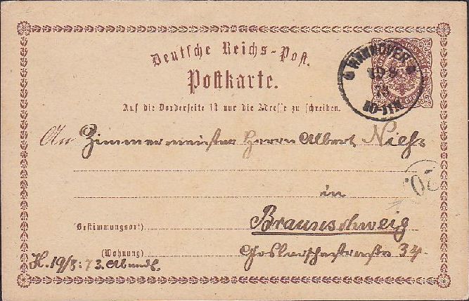 Diese Ganzsache MiNr. P 1 wurde am 03.08.1873 per nachverwendetem braunschweigischem Zweikreisstempel "BRAUNSCHWEIG", katalogisiert als Feuser BS 011, entwertet: