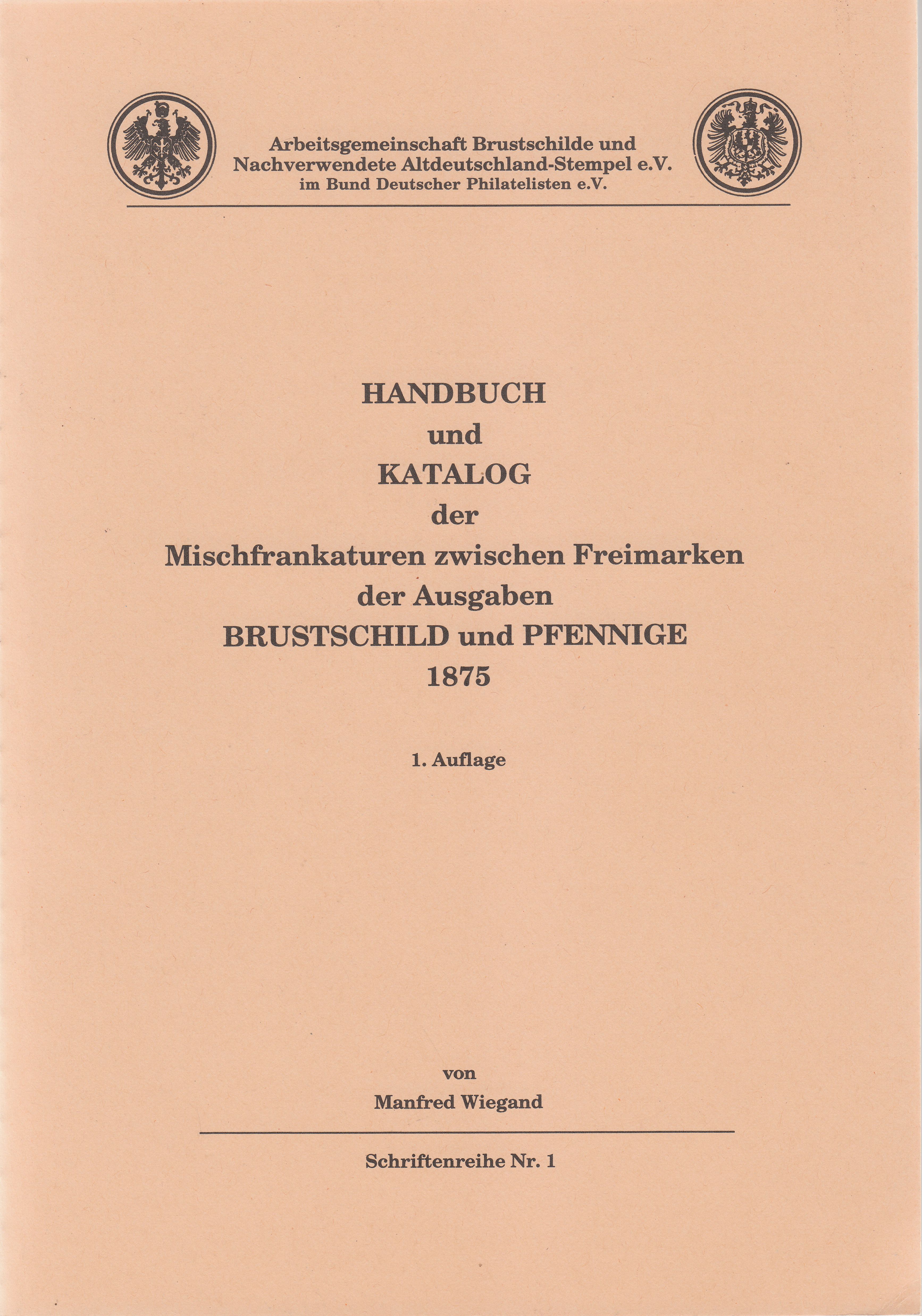 Um in dieses Teilgebiet des Sammelgebietes Brustschild auch mit kleinem Geldbeutel zumindest theoretisch einzusteigen habe ich bei der Messe in Essen für 12 € dieses "HANDBUCH und KATALOG der Mischfrankaturen zwischen Freimarken der Ausgaben BRUSTSCHILD und PFENNIGE 1875 1. Auflage von Manfred Wiegand" anttiquarisch erworben, das als "Nr. 1" in der Schriftenreihe der "Arbeitsgemeinschaft Bruschtschilde und Nachverwendete Altdeutschland-Stempel e.V. im Bund Deutscher Philatelisten e.V." erschienen ist: