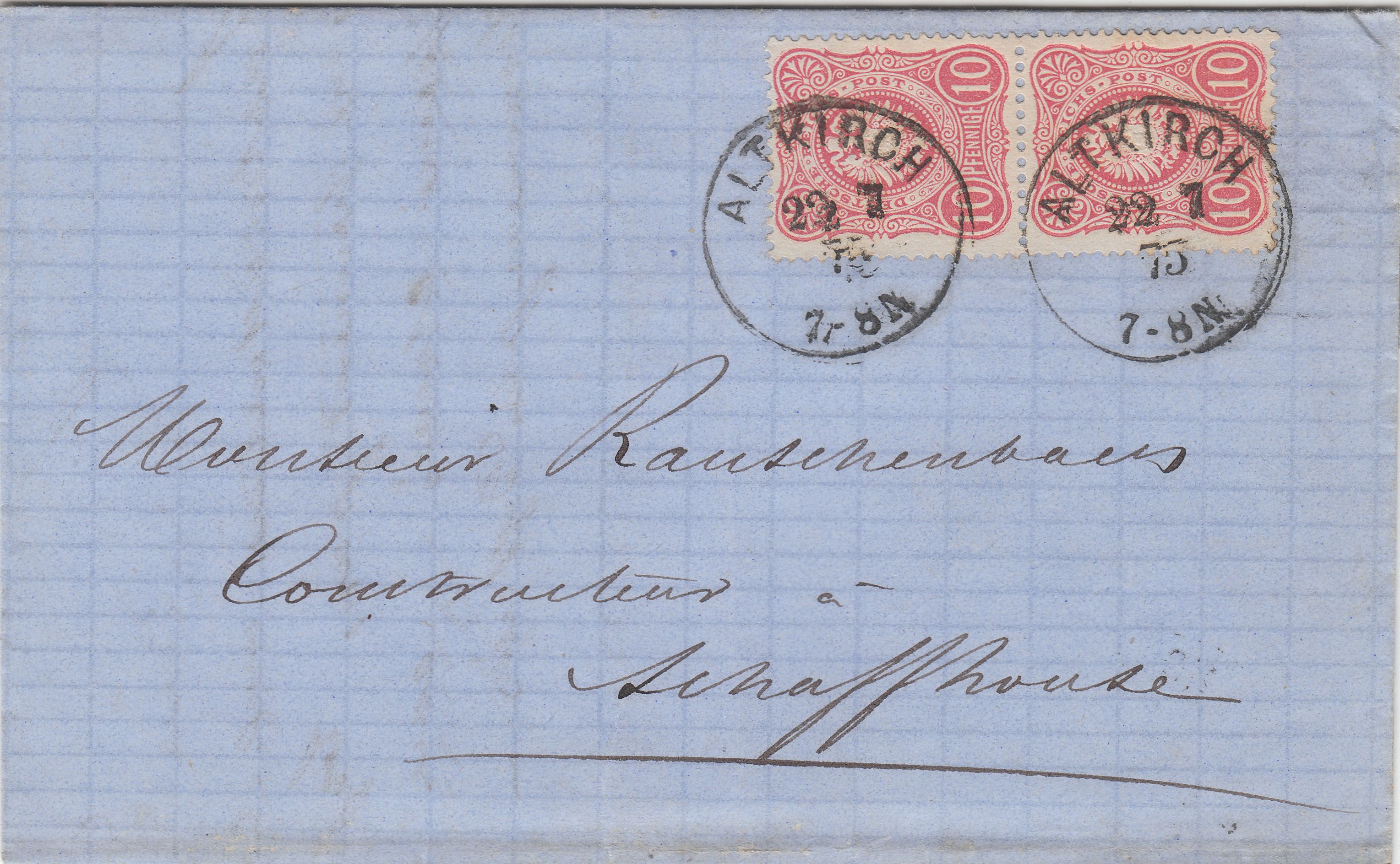 Senkrechtes Paar der MiNr. 33, am 22.07.1875 auf Brief von ALTKIRCH im Oberelsass nach Schaffhausen in der Schweiz, entwertet per nachverwendetem NDP-Kreisstempel: