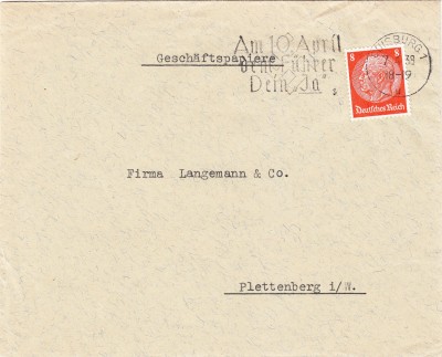 Der Maschinenstempel trägt einen Werbeeinsatz "Am 10.April dem Führer Dein "Ja"".