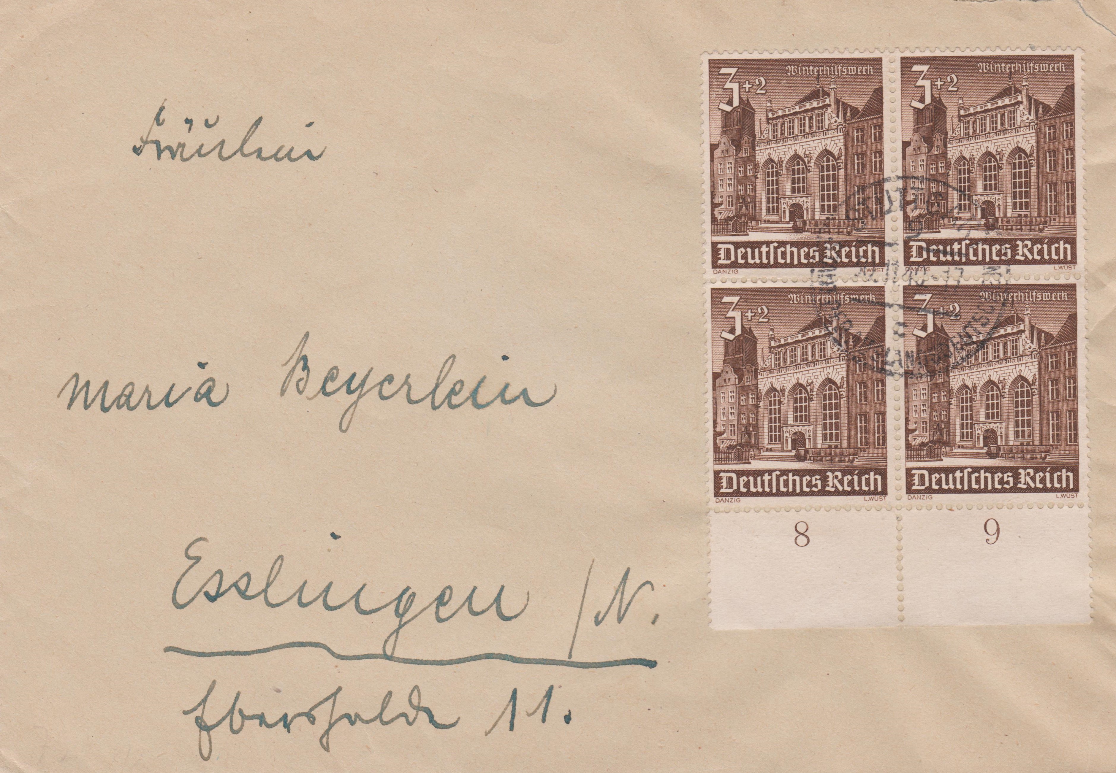 Fernbrief, portogerecht frankiert als Mehrfachfrankatur mit einem Viererblock der Wertstufe 3+2 Pf Winterhilfswerk 1940, Deutsches Reich MiNr 751, vom Unterrand, adressiert nach "Esslingen", entwertet am 30.11.1940 "STUTTGART 9 c STADT DER AUSLANDSDEUTSCHEN":