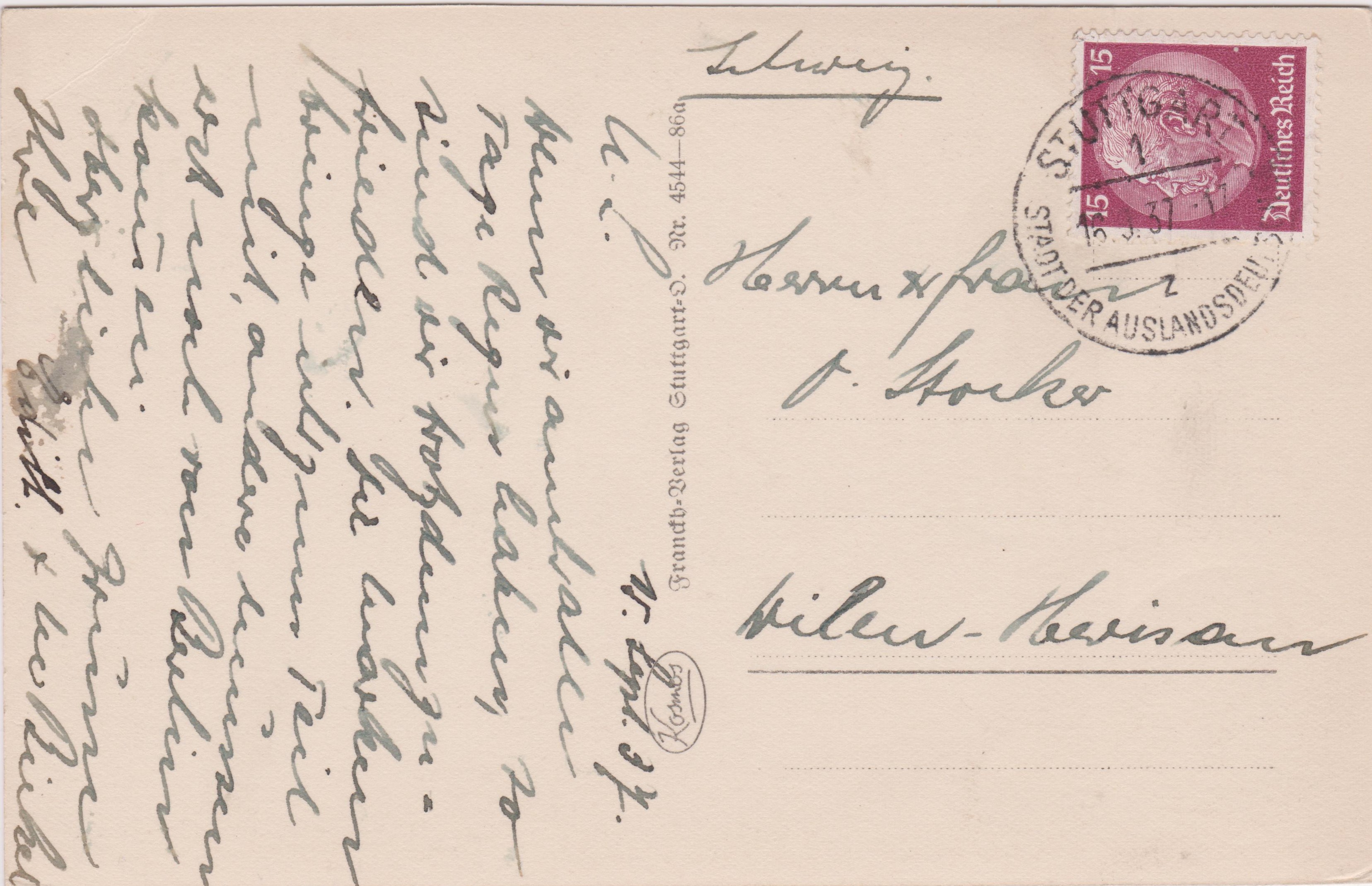 Postkarte in die Schweiz, Portostufe 15 Pf, am 16.09.1937 portogerecht freigemacht per Einzelfrankatur eines 15 Pf-Wertes der Dauerserie Hindenburg, entwertet "STUTTGART 1 z STADT DER AUSLANDSDEUTSCHEN":