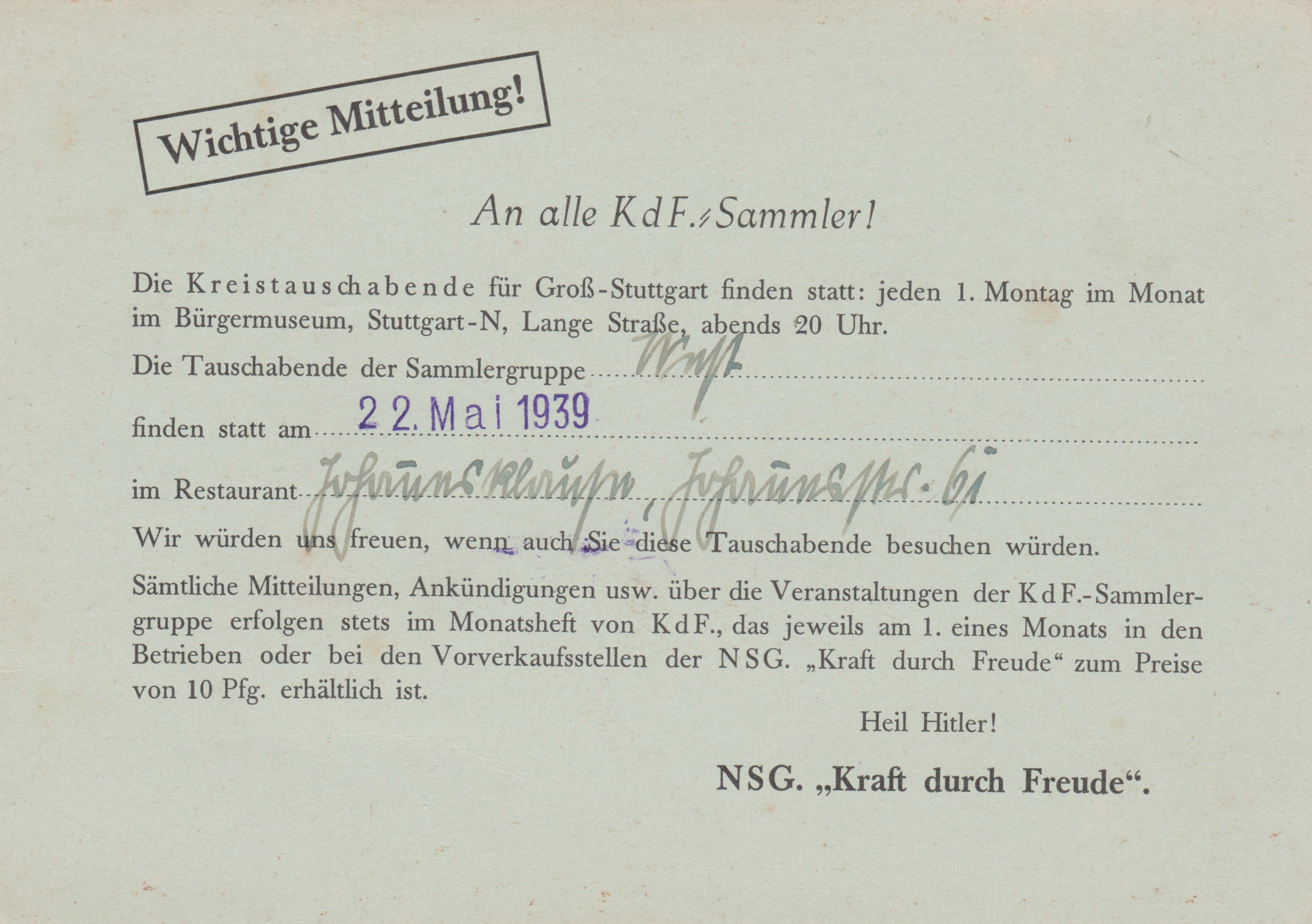 Die Entwertung der Dienstmarke erfolgte per Maschinenstempel STUTTGART 9 e mit Werbeeinsatz "V.Reichtagung der Auslandsdeutschen Stuttgart 29.8.-5.9.1937".