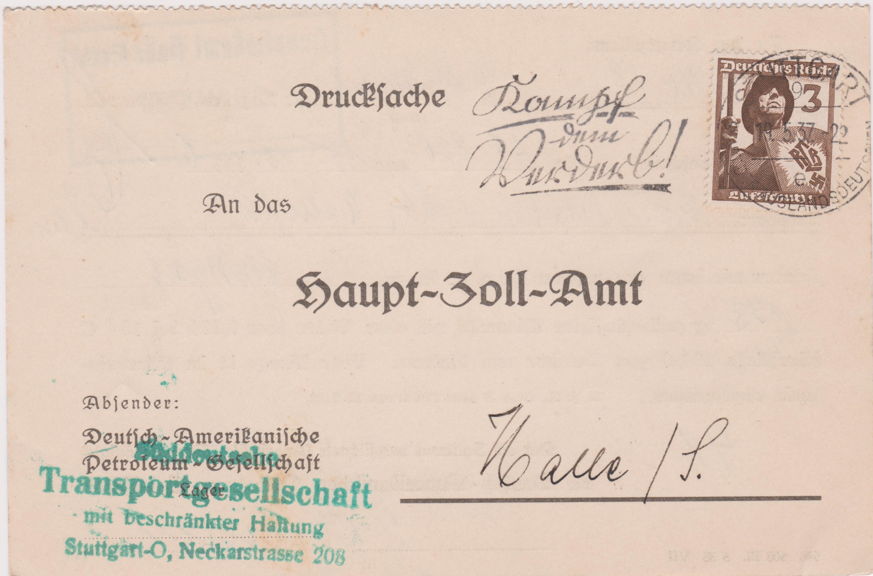 "An das Haupt-Zoll-Amt" in Halle adressierter Drucksachenvordruck, am 19.05.1937 portogerecht mit 3 Pf frankiert und entwertet per Maschinenstempel "STUTTGART 9 e" mit Text in Sütterlinschrift "Kampf dem Verderb!":