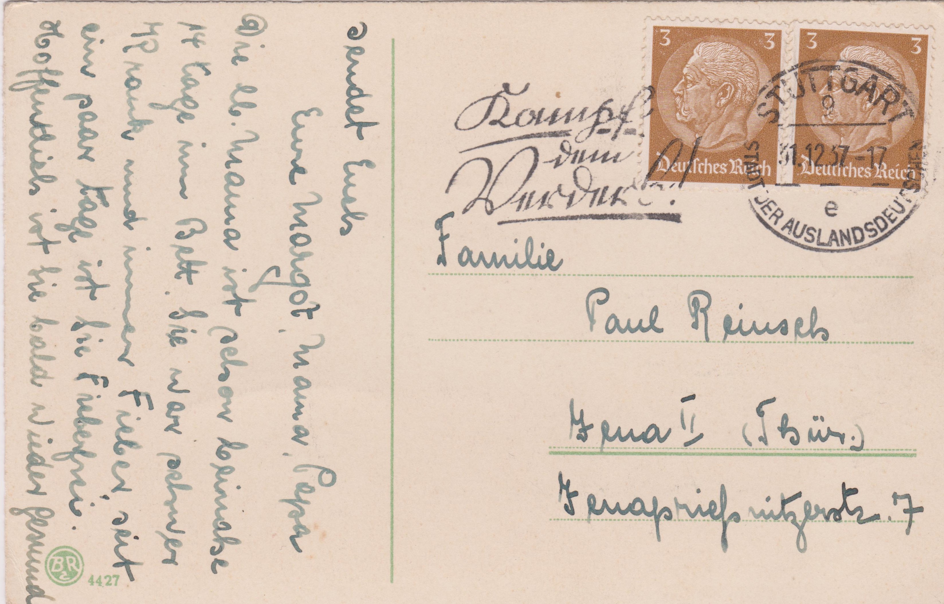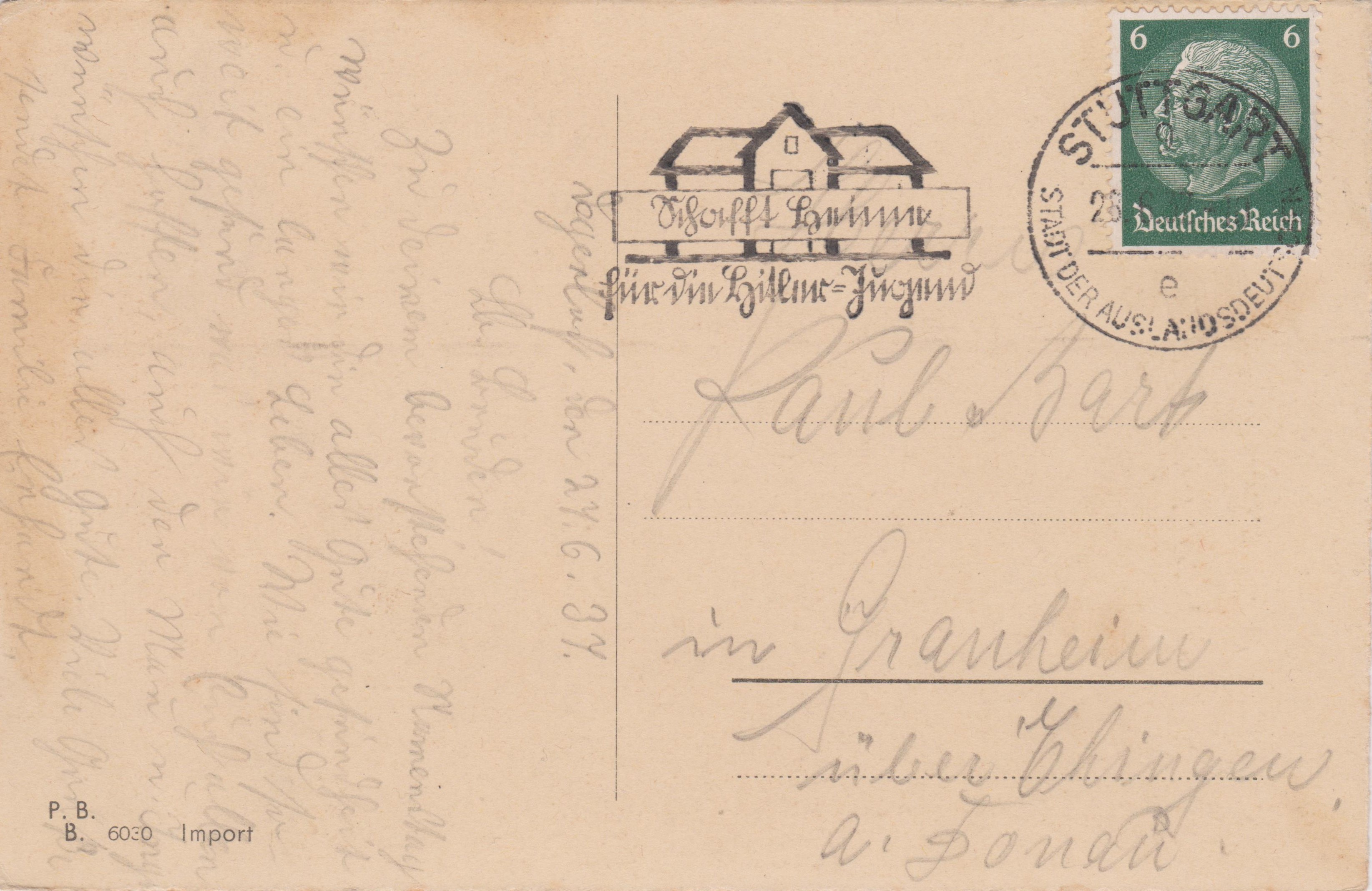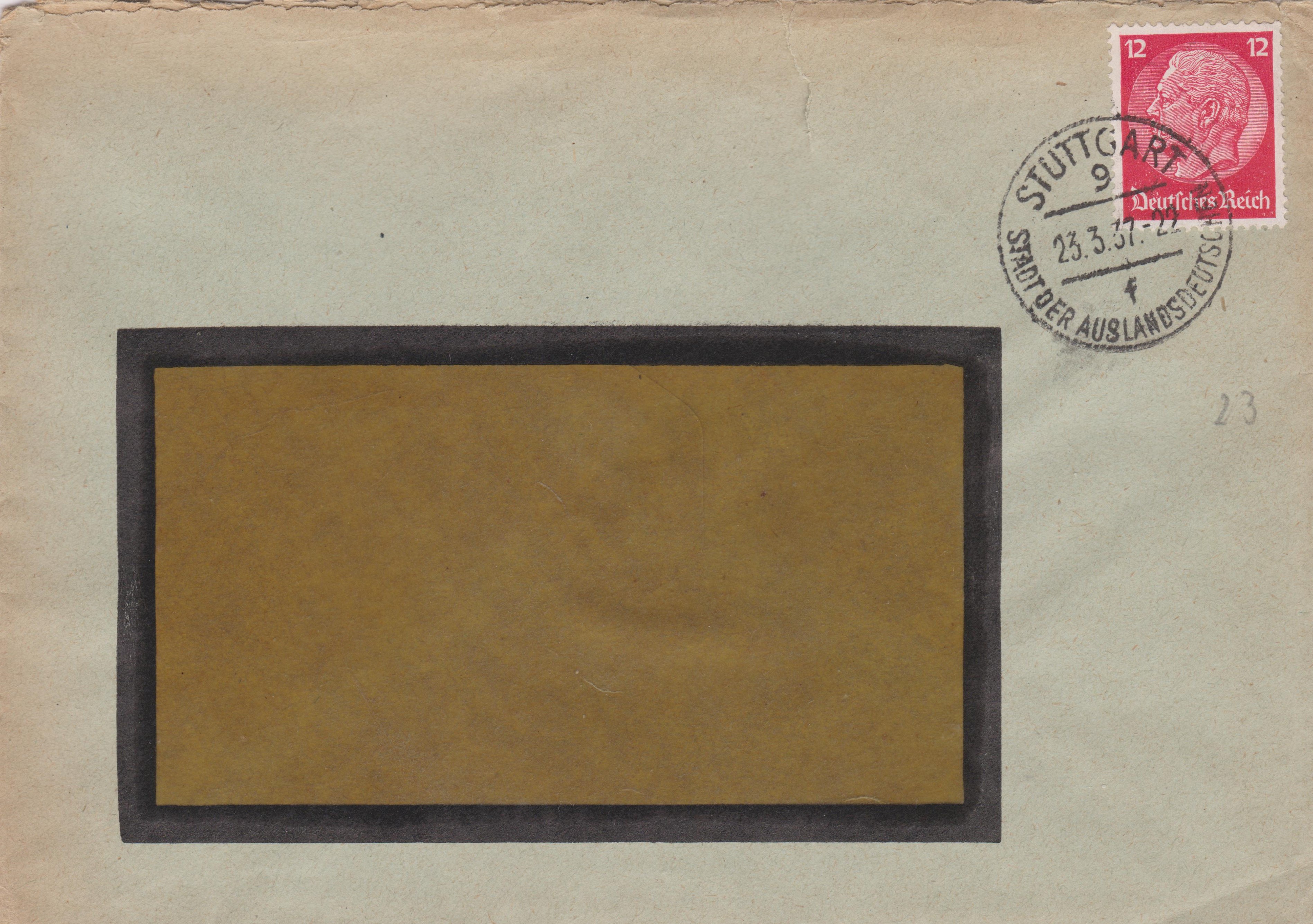 Portostufe 12 Pf, einem Fernbrief entsprechend, aufgegeben am 23.03.1937 in STUTTGART 9, entwertet per Handstempel "STUTTGART 9 f STADT DER AUSLANDSDEUTSCHEN":